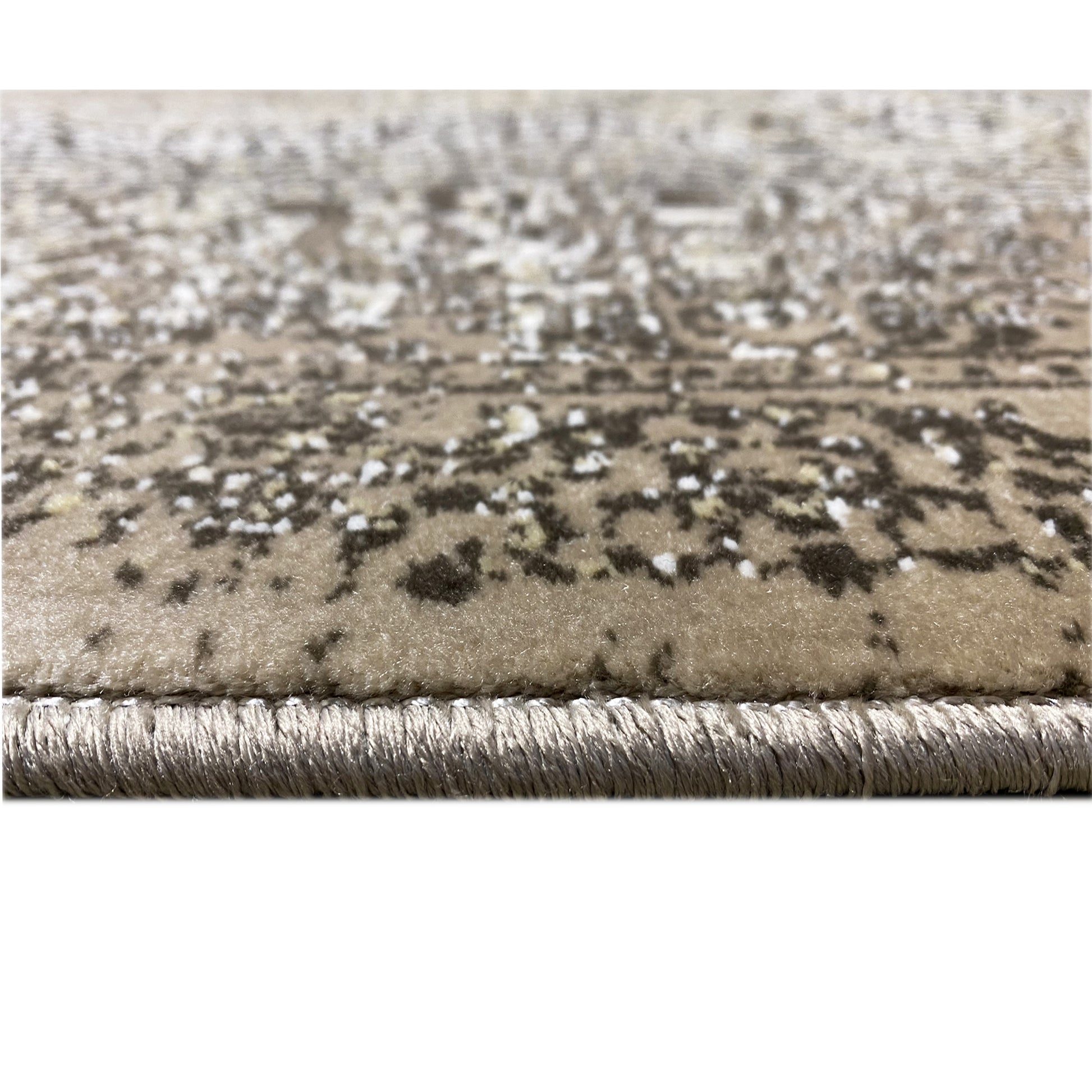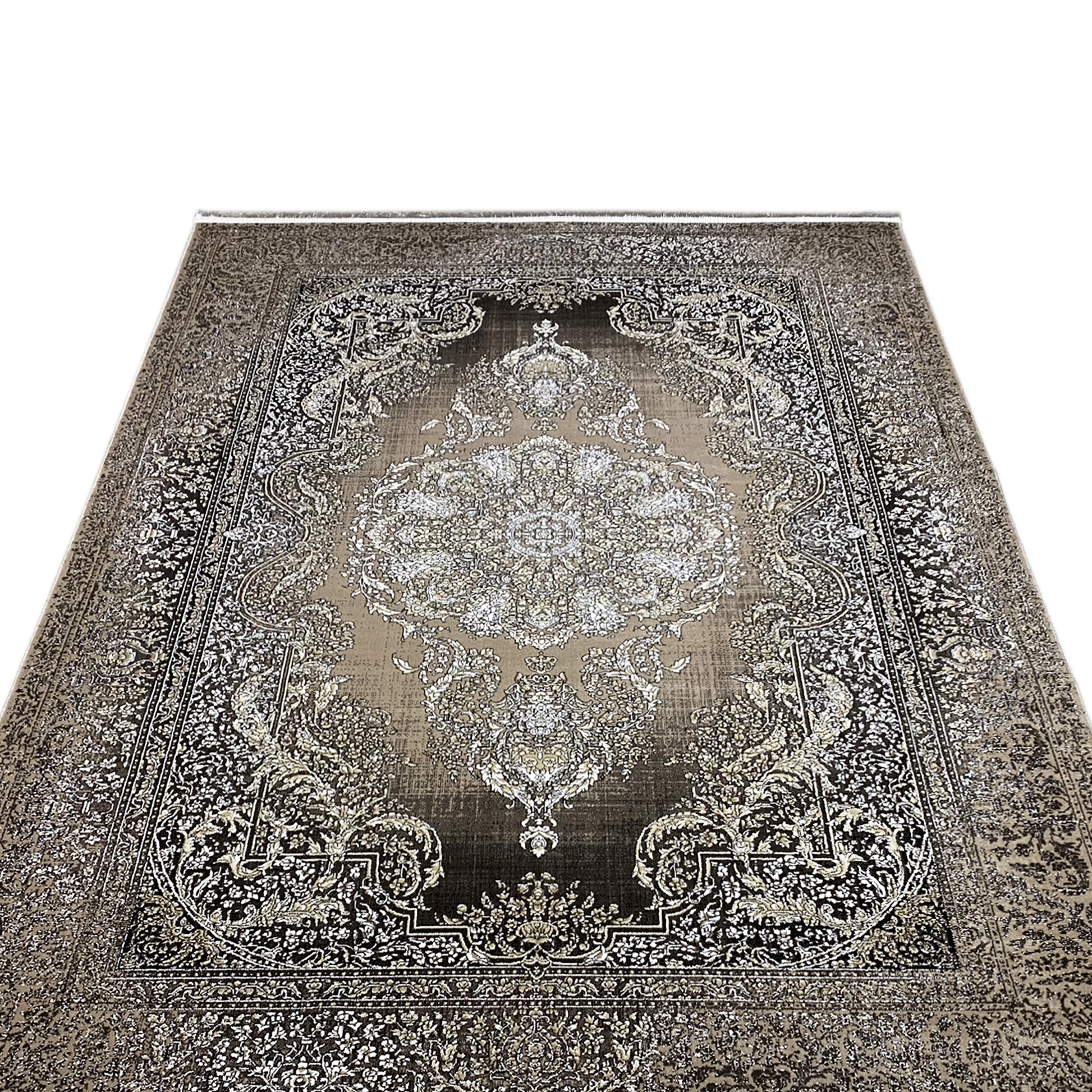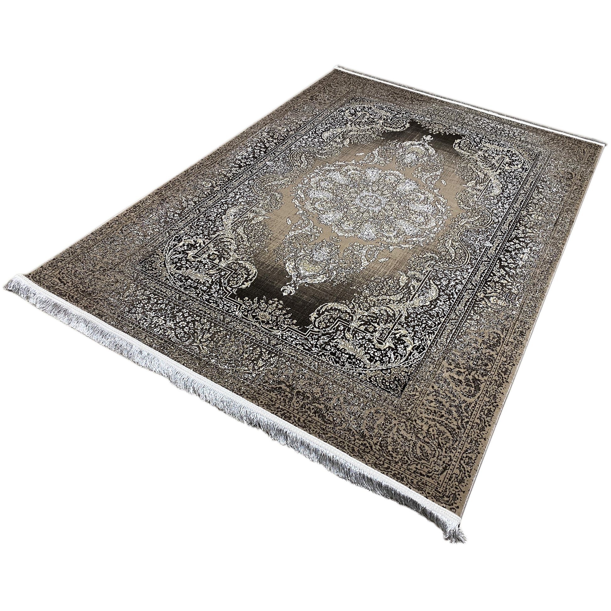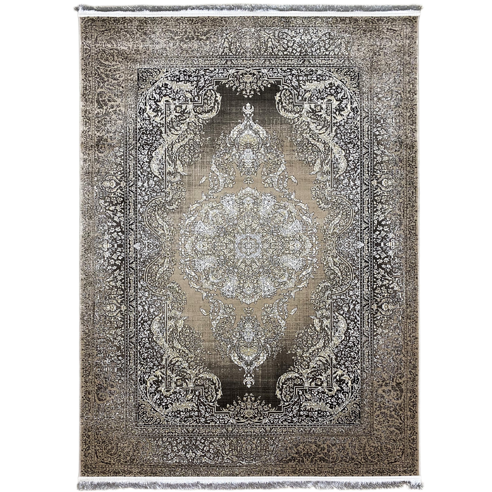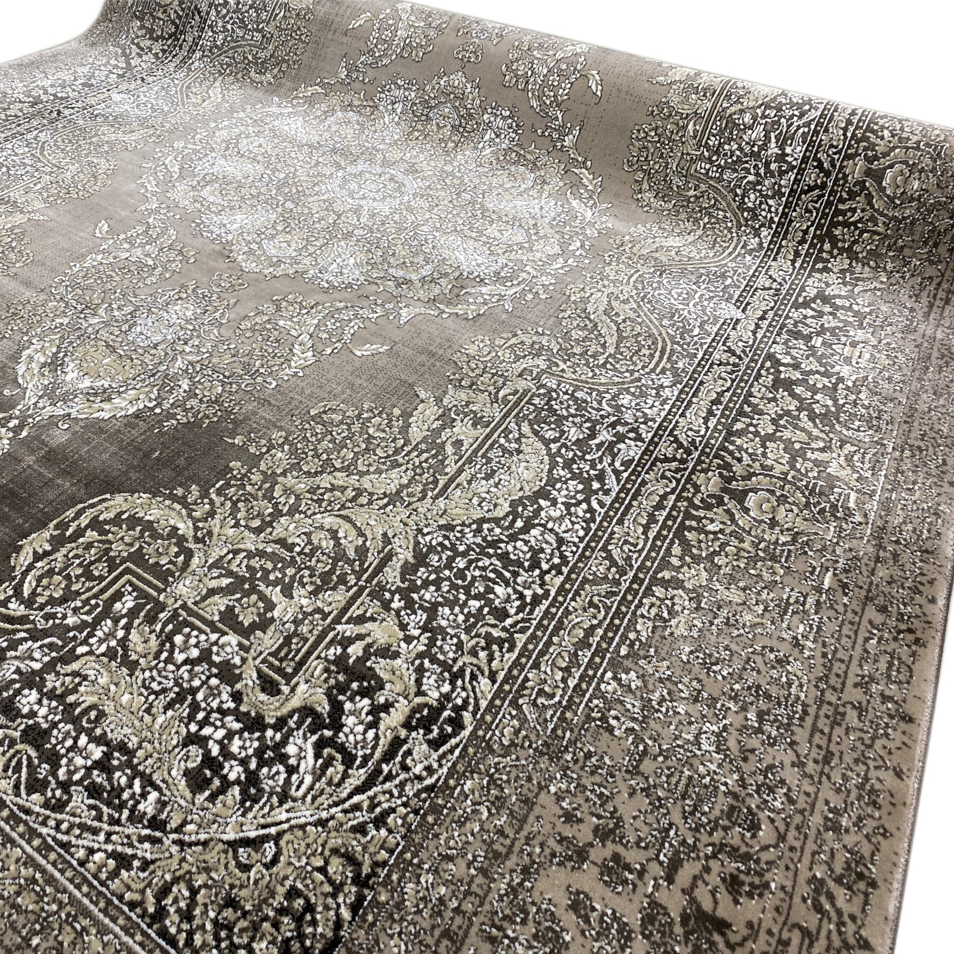 Add a touch of timeless elegance to your home with this beautiful classic rug. The artistic central medallion and detailed floral pattern in shimmering antique silver and beige tones stand out against a smoky, subtly faded background. Made from 100% heat-treated acrylic, this soft and durable rug is perfect for high-traffic areas, combining luxurious style with modern resilience. The generous size of 170x240cm is ideal for adding an elegant focal point to your living or bedroom.