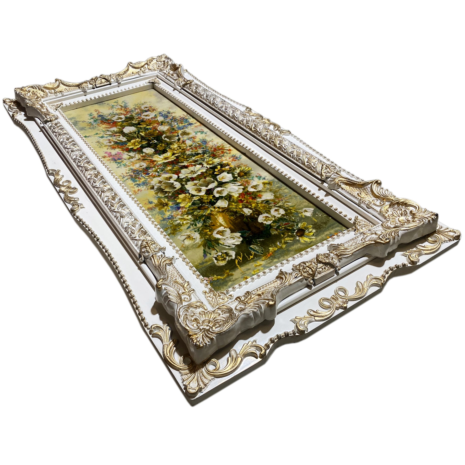 This unique, hand-knotted pictorial carpet measuring 98x37cm is made from a noble blend of wool and silk. It features a detailed, figurative floral motif in vibrant colors, arranged in an elegant still life. Framed in an ornate, classic style, this pictorial carpet serves as an impressive wall art that adds an artistic and fresh touch to any interior.