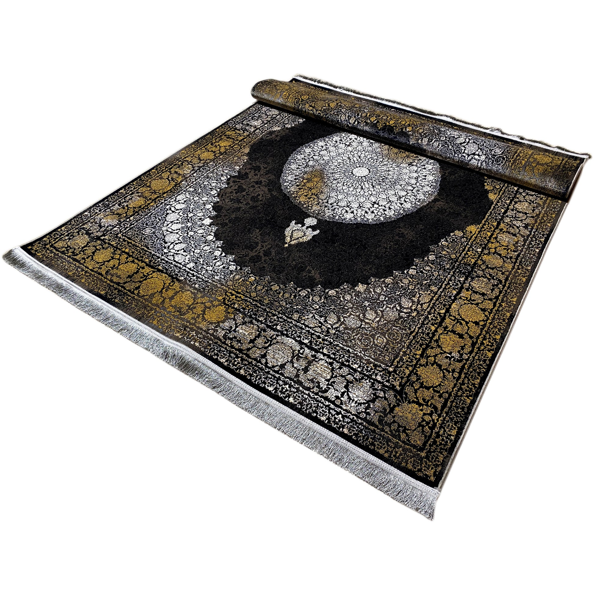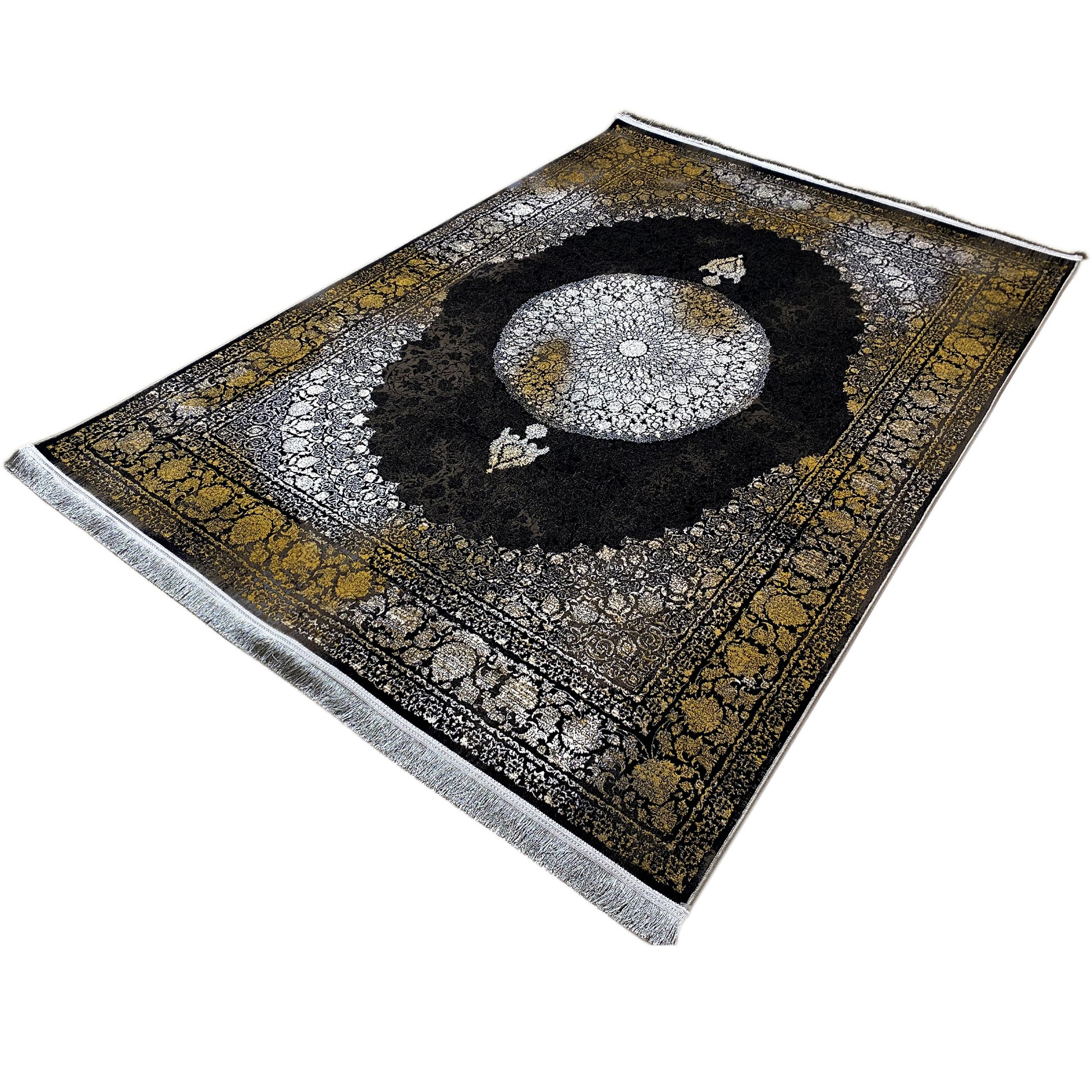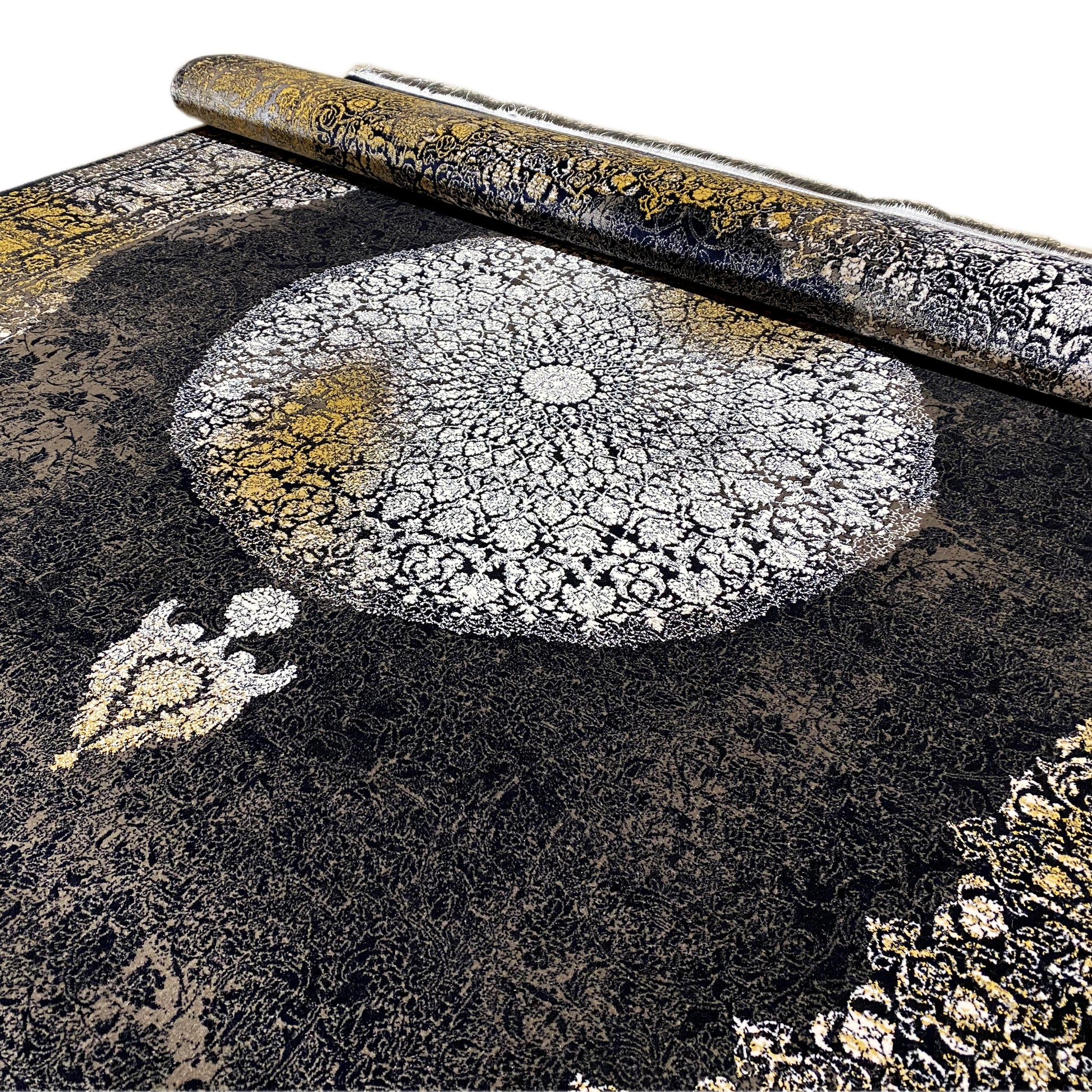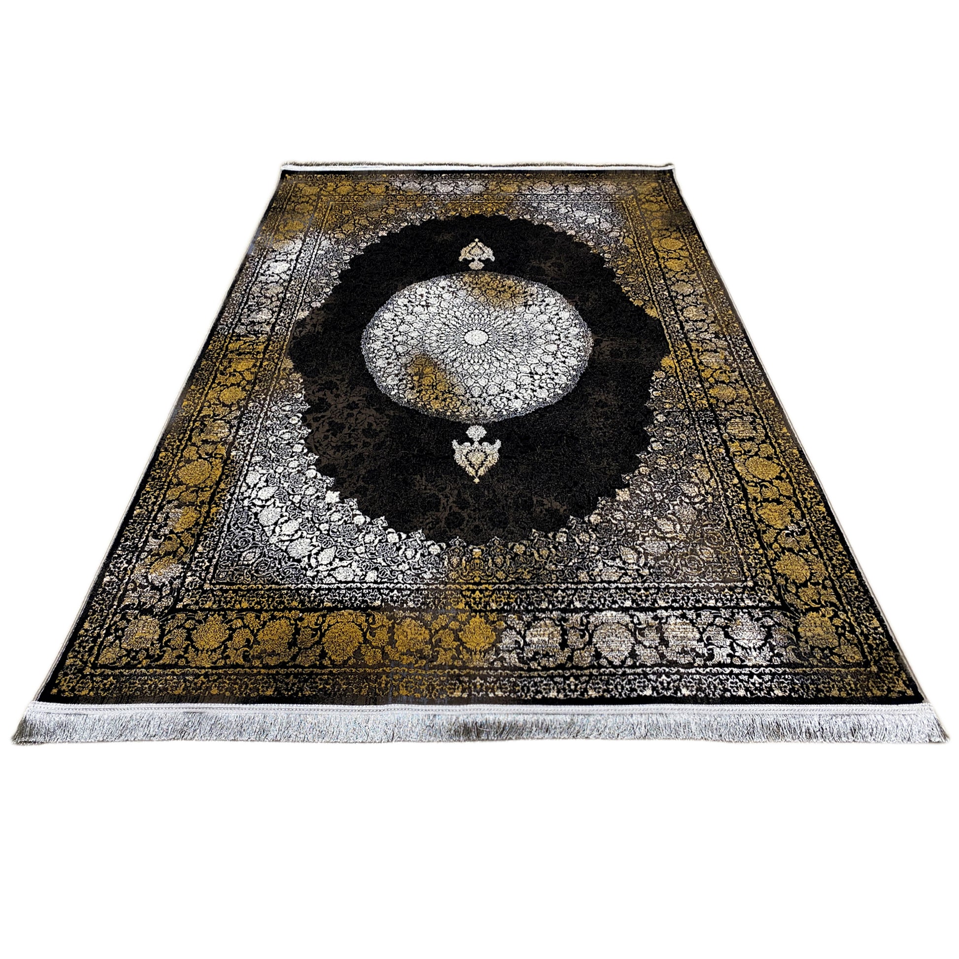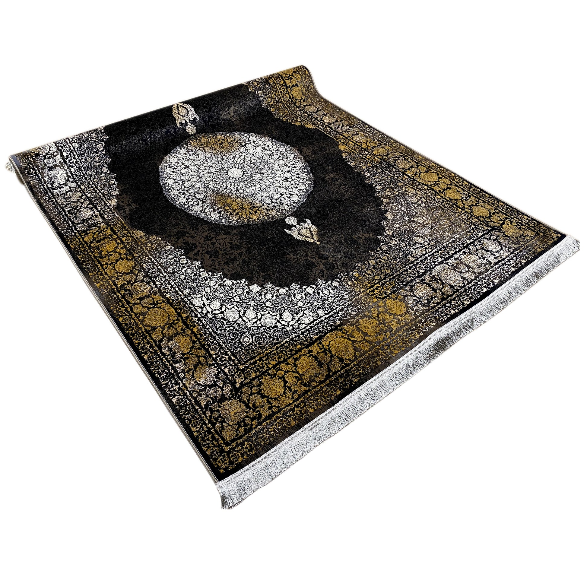 Add a touch of luxurious elegance to your home with this beautiful classic rug. The striking, smoky inner field creates an impressive contrast to the bright, golden border and the detailed medallion in the center. Made from 100% heat-treated acrylic, this soft and durable rug is perfect for high-traffic areas, combining luxurious style with modern resilience. The generous size of 170x240cm is ideal for adding an elegant focal point to your living or bedroom.