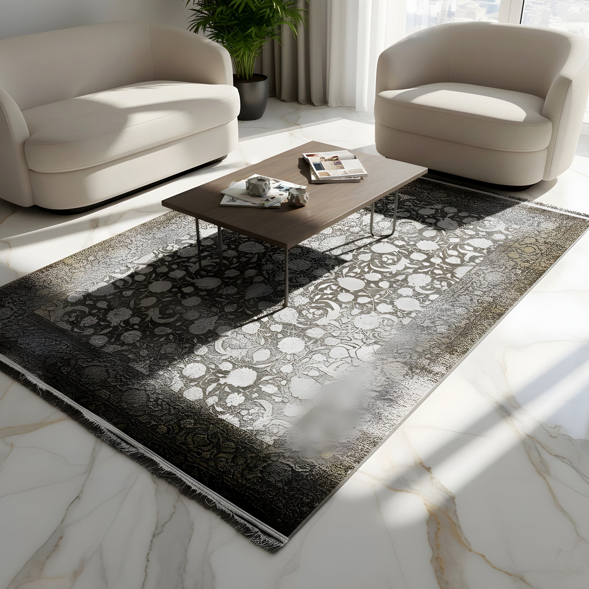 Give your home a luxurious, timeless atmosphere with this beautiful classic rug. The stunning, continuous floral pattern in shimmering gold tones elegantly stands out against a dark, smoky background, creating a refined, faded vintage look. Made from 100% heat-treated acrylic, this soft and durable rug is ideal for high-traffic areas. The generous size of 170x240cm is perfect for adding a stylish accent to your living or dining room.