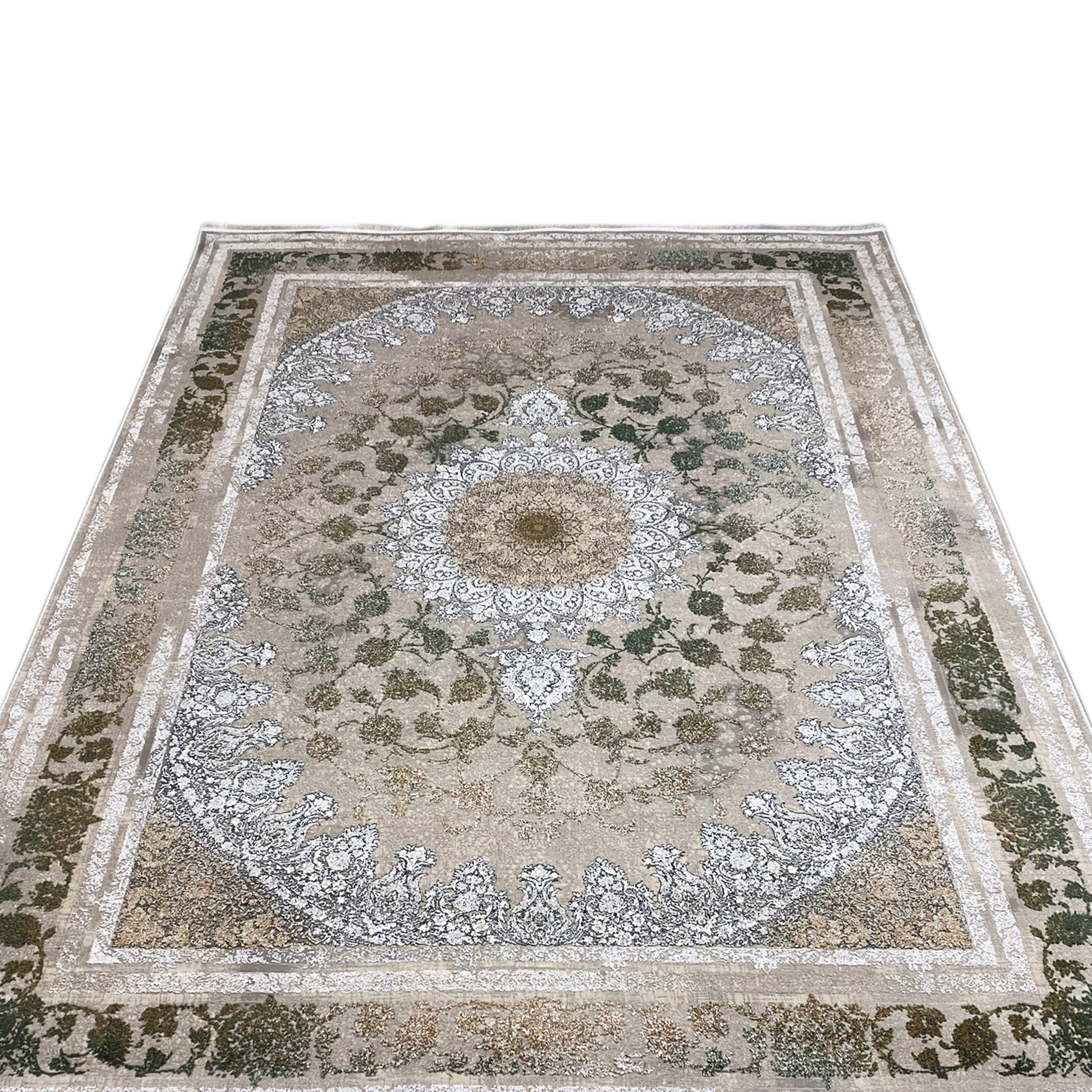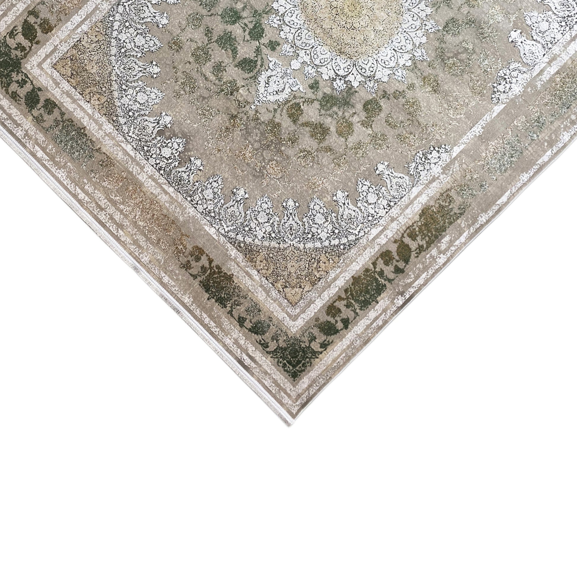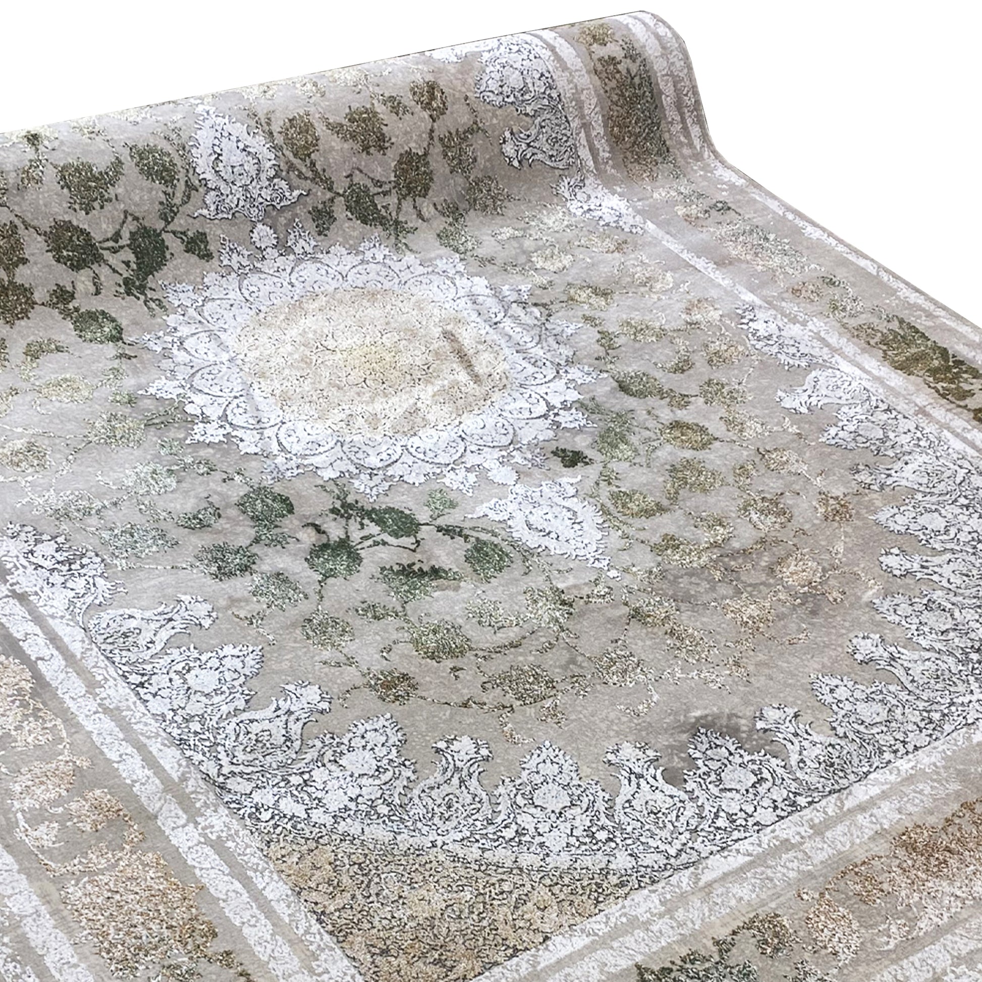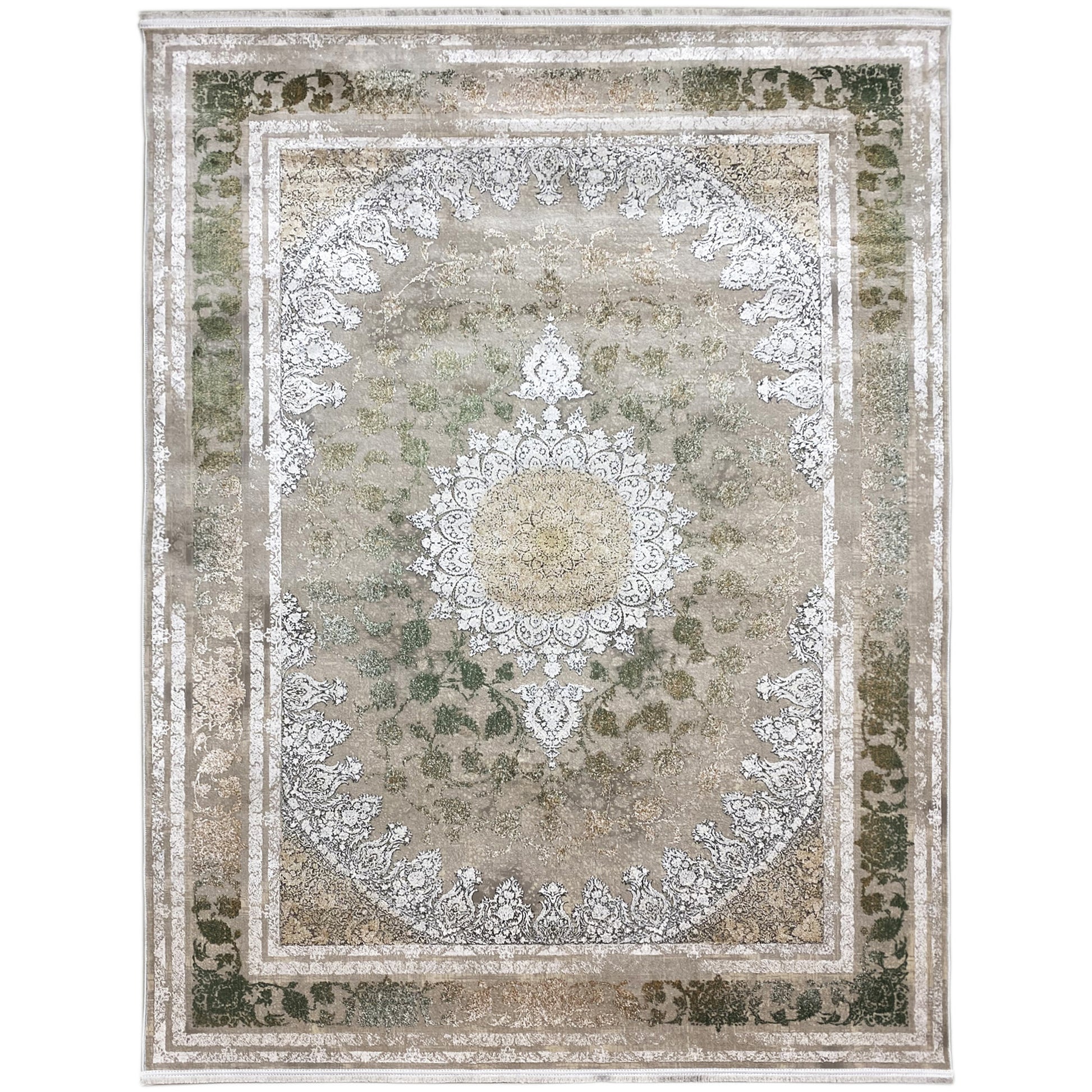 Give your home a luxurious, timeless atmosphere with this beautiful classic rug. The striking central medallion and the detailed pattern in shimmering silver and green tones elegantly stand out against a smoky, subtly faded background. Made from 100% heat-treated acrylic, this soft and durable rug is perfect for high-traffic areas. The generous size of 170x240cm is ideal for adding a stylish accent to your living or dining room.