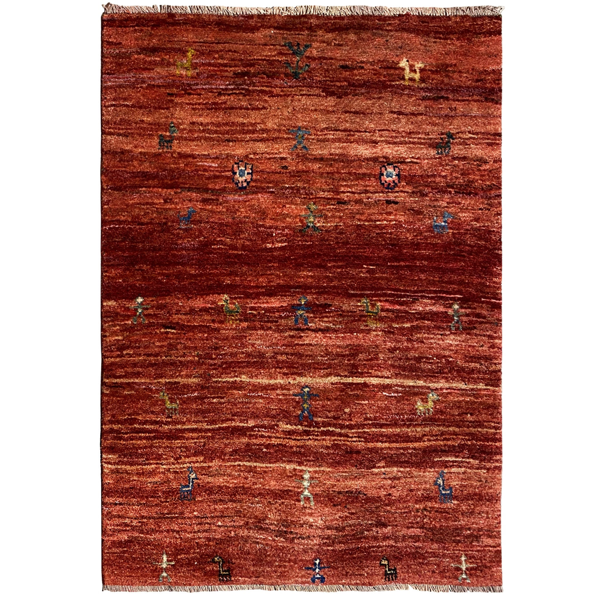 This expressive, hand-knotted Gabbeh rug in the size 140x93cm is made from hand-spun, plant-dyed wool. Its deep red field is enlivened by a variety of small, playful animal and figure motifs in colorful accents that tell a traditional story. This unique rug adds a warm and authentic atmosphere to any room, whether in rustic, tribal, or eclectic style, and is a true work of art for the floor.