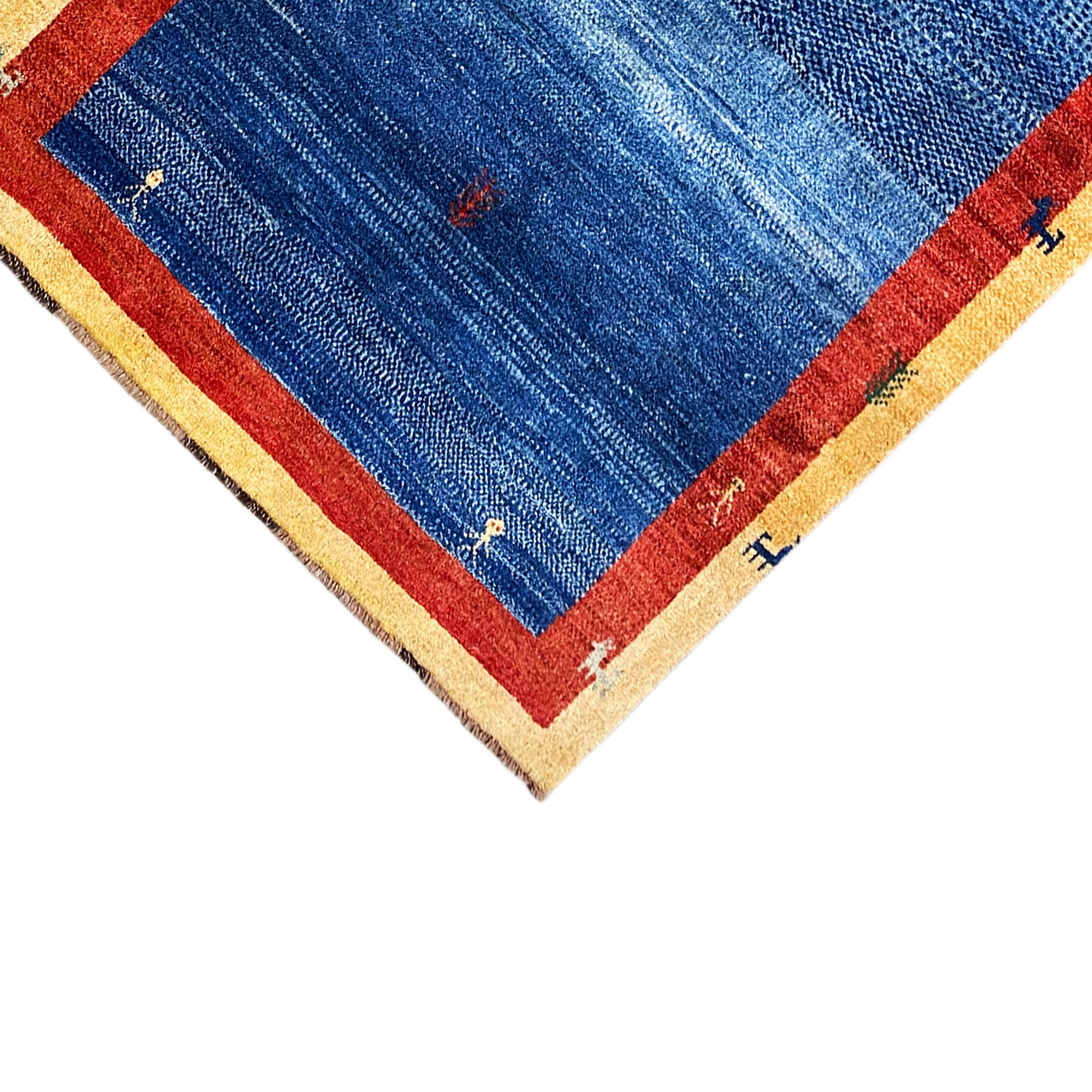 This expressive, hand-knotted Gabbeh rug made from hand-spun, plant-dyed wool features a deep blue center surrounded by a striking red inner border and a wide yellow outer border with stylized figures. Measuring 192x120 cm, it is a versatile statement piece that adds a vibrant yet grounded atmosphere to any room, from traditional to modern. The combination of traditional craftsmanship, bright colors, and the unique figurative pattern makes this rug a special eye-catcher that both attracts visual interest and provides coziness.