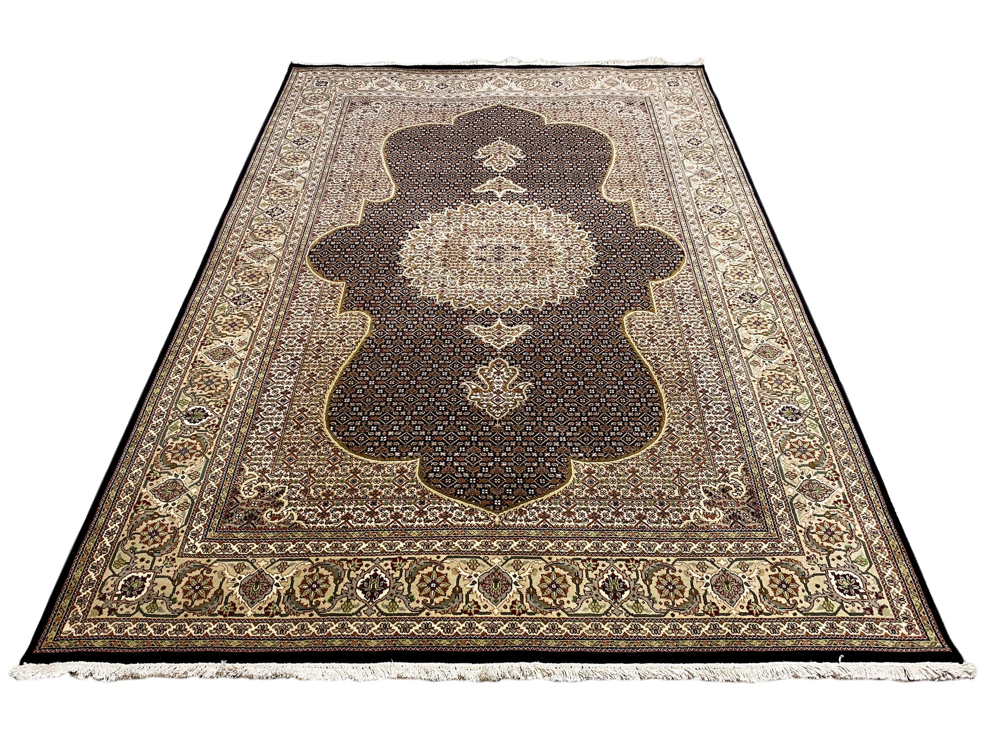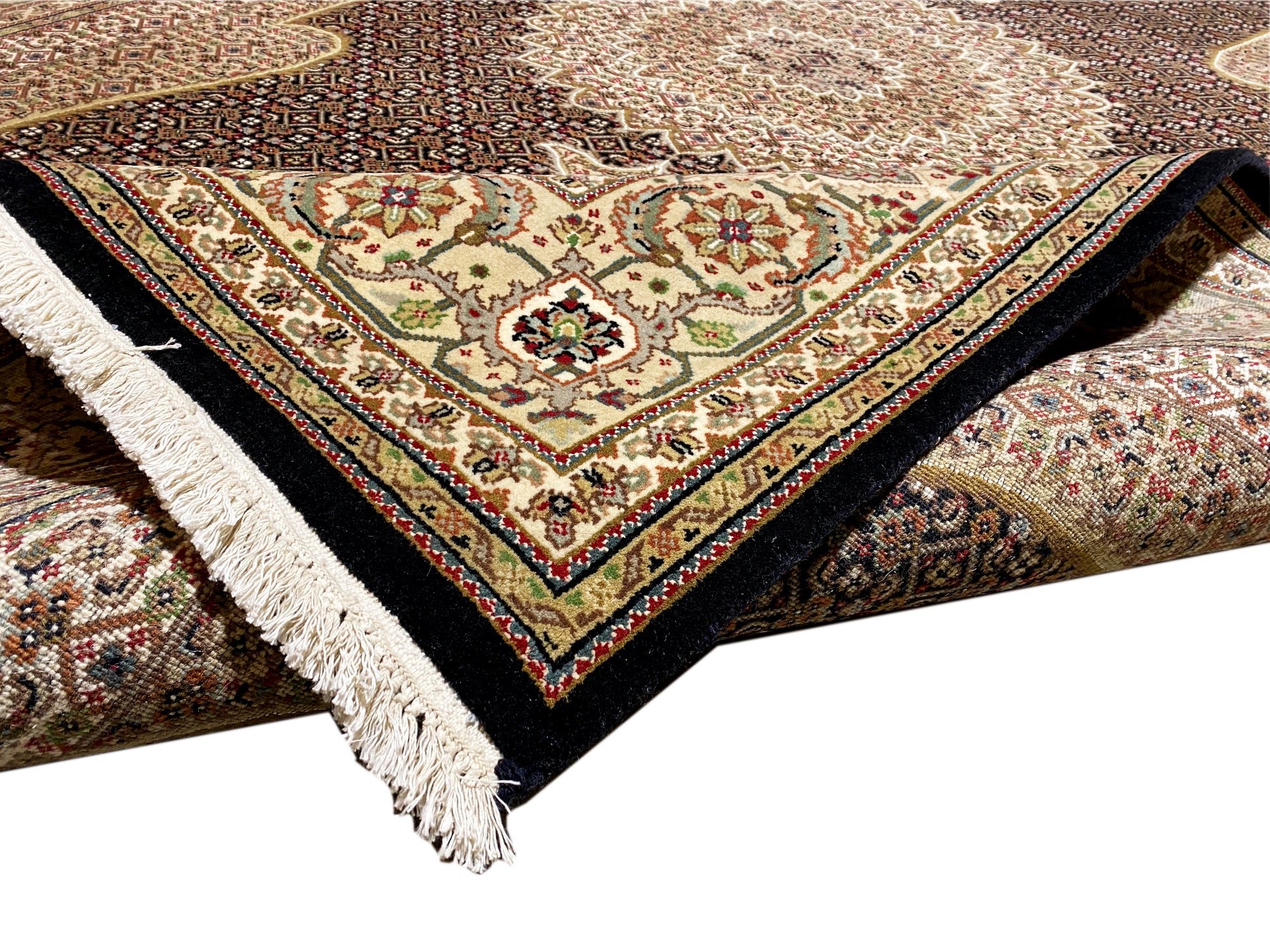 This hand-knotted Indo Tabriz rug made from high-quality wool and silk impresses with its fine craftsmanship and luxurious appearance. The harmonious combination of brown and cream gives your living space a warm, elegant atmosphere and fits perfectly with both classic and oriental interior styles. The artistic medallion pattern with floral details creates a timeless look and highlights the exclusive craftsmanship. With a size of 297x201 cm, the rug is ideal for living and dining areas, offering a stylish and durable addition to your home.