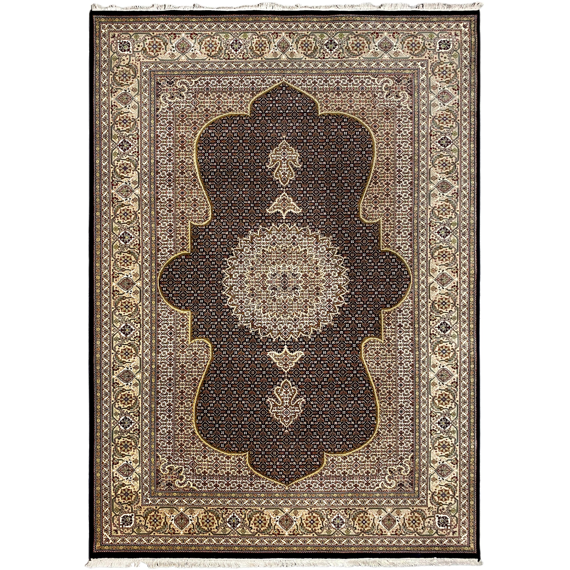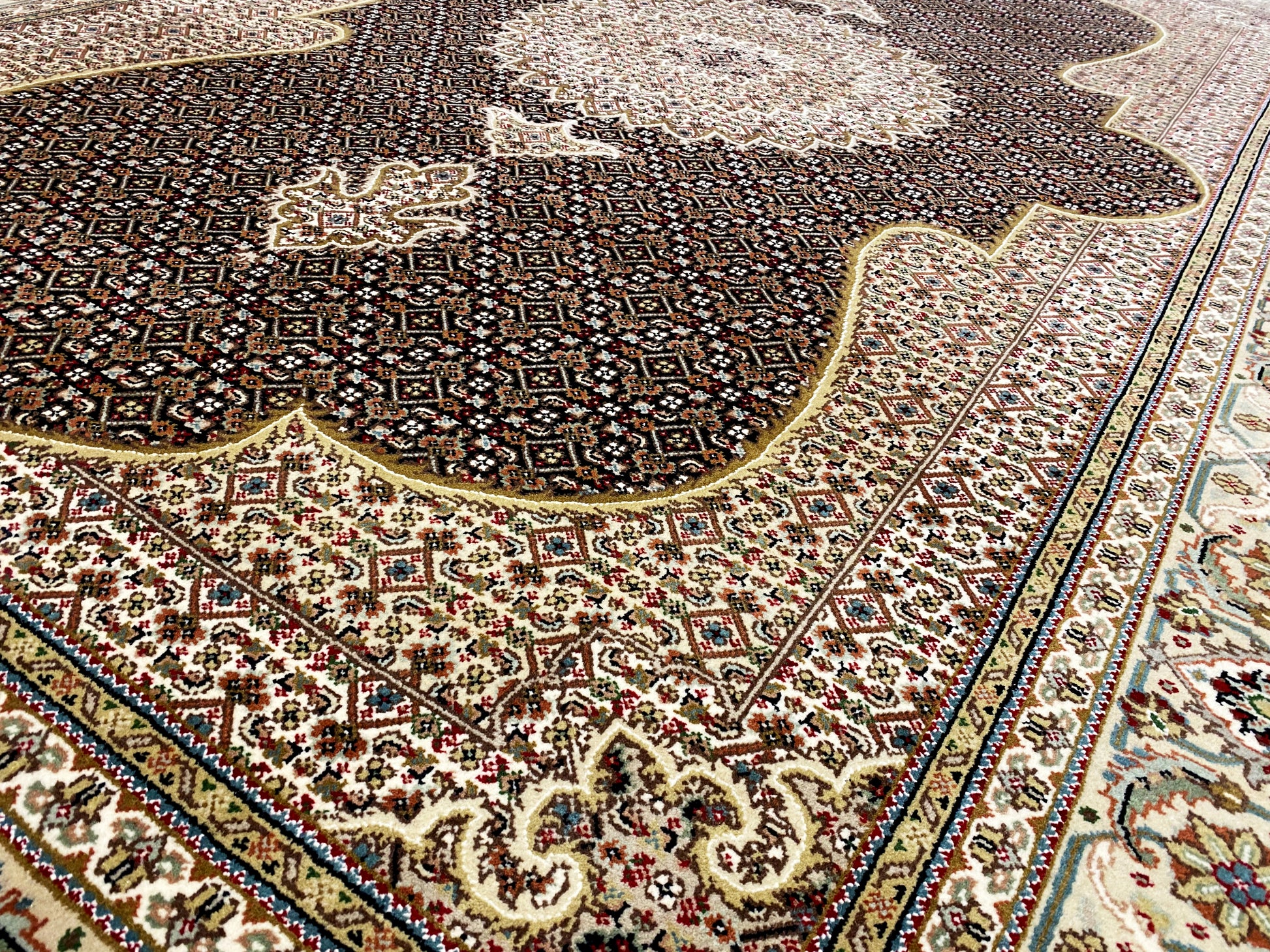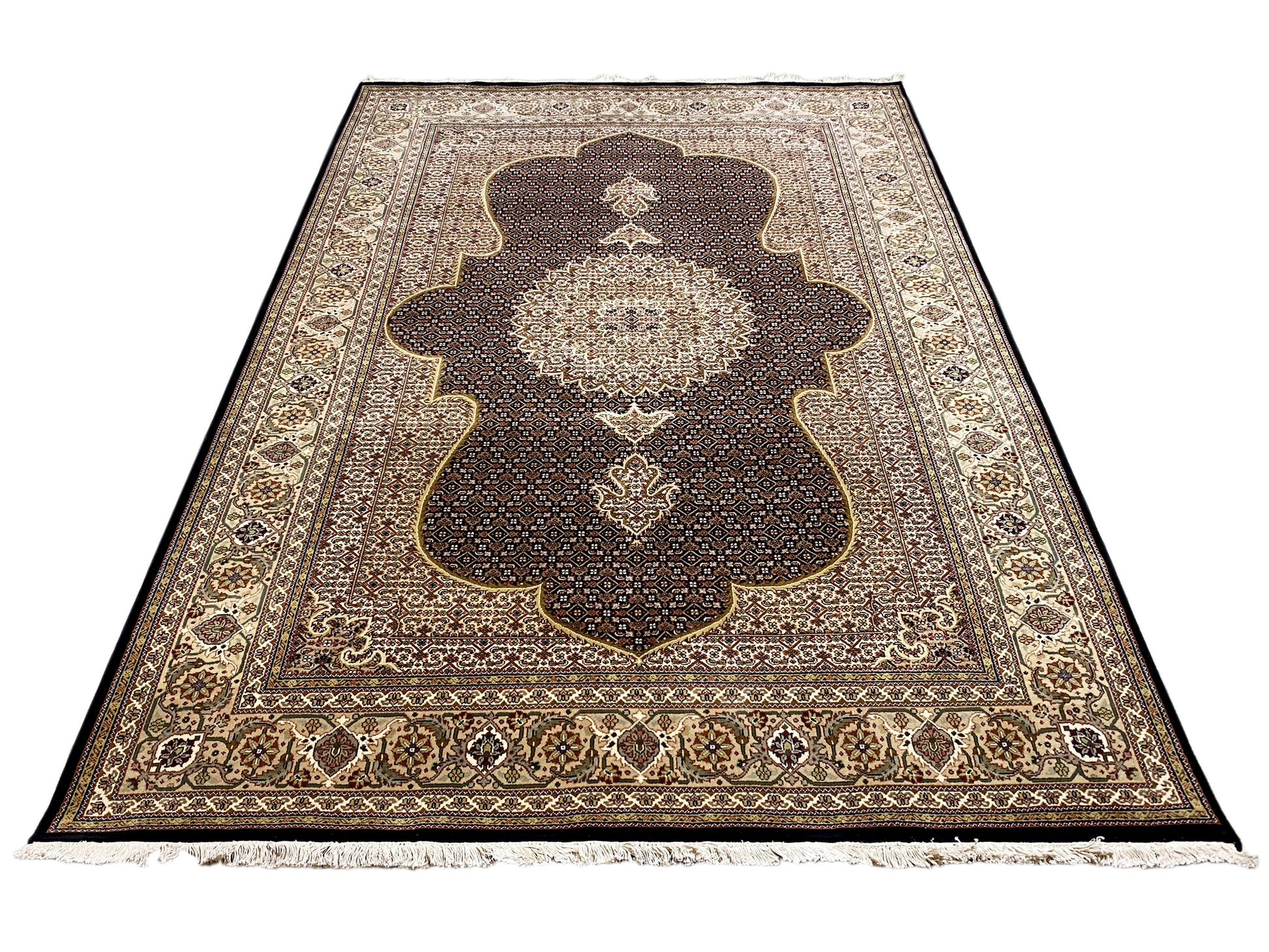 This hand-knotted Indo Tabriz rug made of fine wool and silk impresses with its detailed craftsmanship and elegant sheen. The harmonious color combination of brown and beige gives any room a warm and luxurious atmosphere and fits perfectly with both classic and oriental interior styles. The artistic medallion pattern with floral elements emphasizes traditional elegance. With a size of 298x198 cm, the rug is ideal for living and dining areas, offering durability, comfort, and timeless beauty.