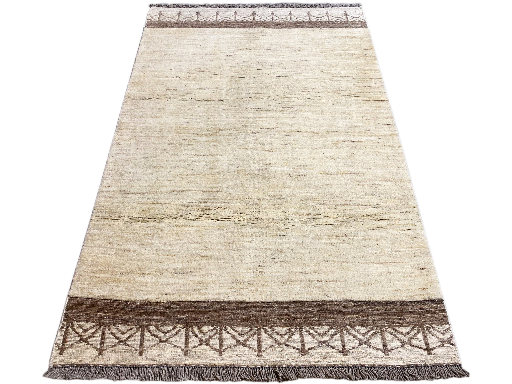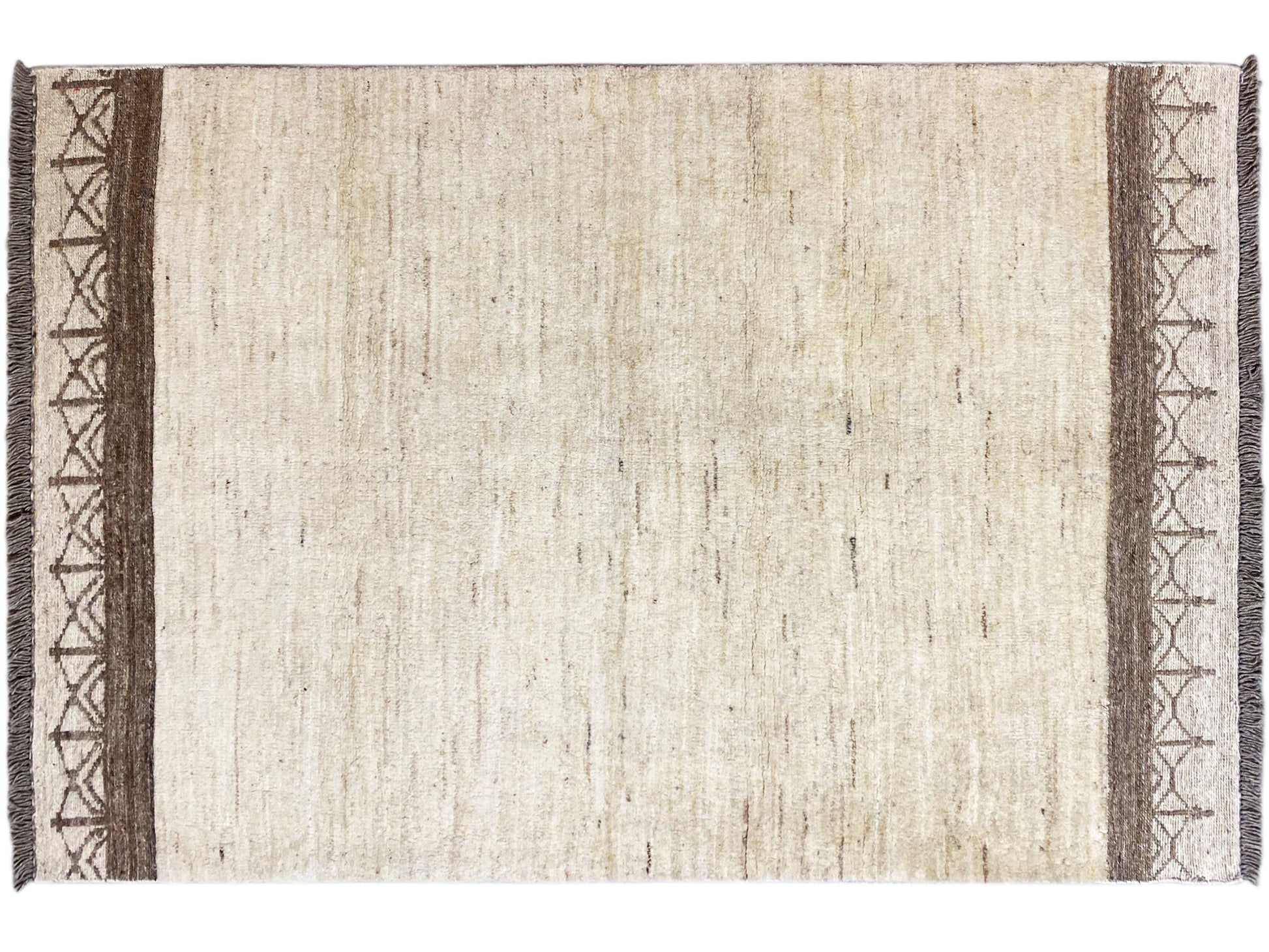 This handwoven Kilim Gabbeh rug made from 100% hand-spun wool features an elegant beige base with subtle brown borders and fine ethnic pattern details. Measuring 174x110 cm, it is perfect for living or sleeping areas and complements modern, Scandinavian, and minimalist interior styles harmoniously. The simple design with subtle tribal elements creates a calm, stylish atmosphere, while the high-quality wool craftsmanship ensures durability, comfort, and a pleasantly soft feel underfoot – ideal for a cozy and stylish home.