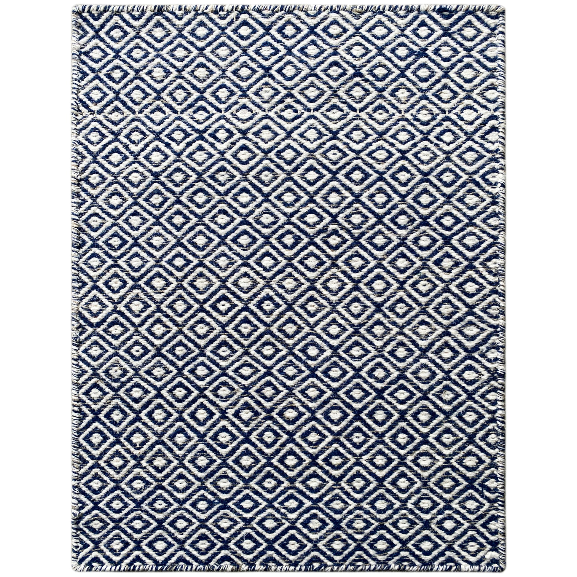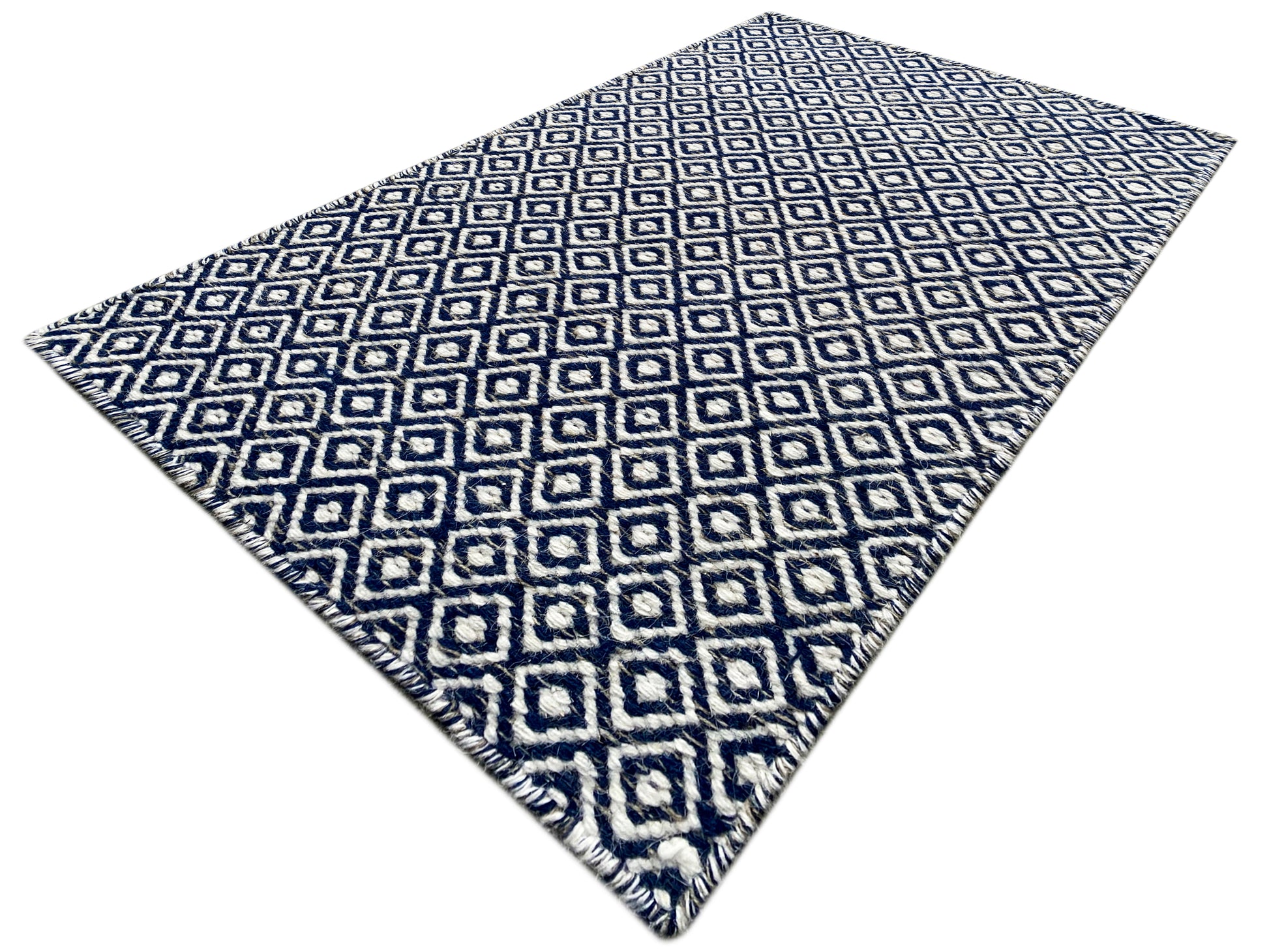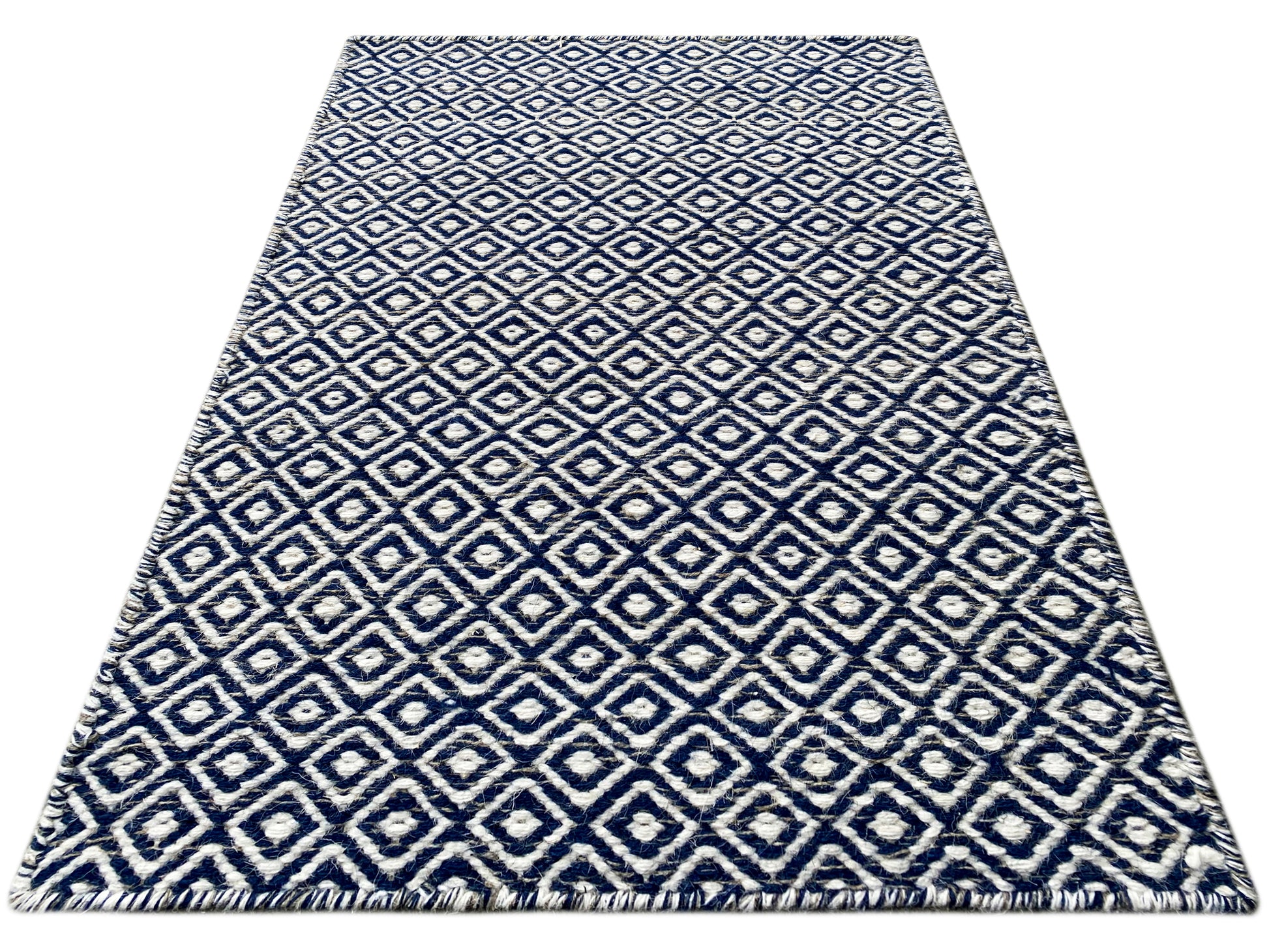This handwoven kilim rug made of pure wool combines traditional craftsmanship with a timeless, geometric diamond pattern. With its compact dimensions of 60x90 cm, it is the ideal choice to add maritime touches or Scandinavian accents in hallways, bedrooms, or cozy nooks. The high-quality natural fiber not only provides a pleasant feel underfoot but is also particularly durable and easy to care for. Thanks to the contrasting blue and white design, this unique piece fits seamlessly into both modern and classic interior styles, giving any room a textured, homely atmosphere.
