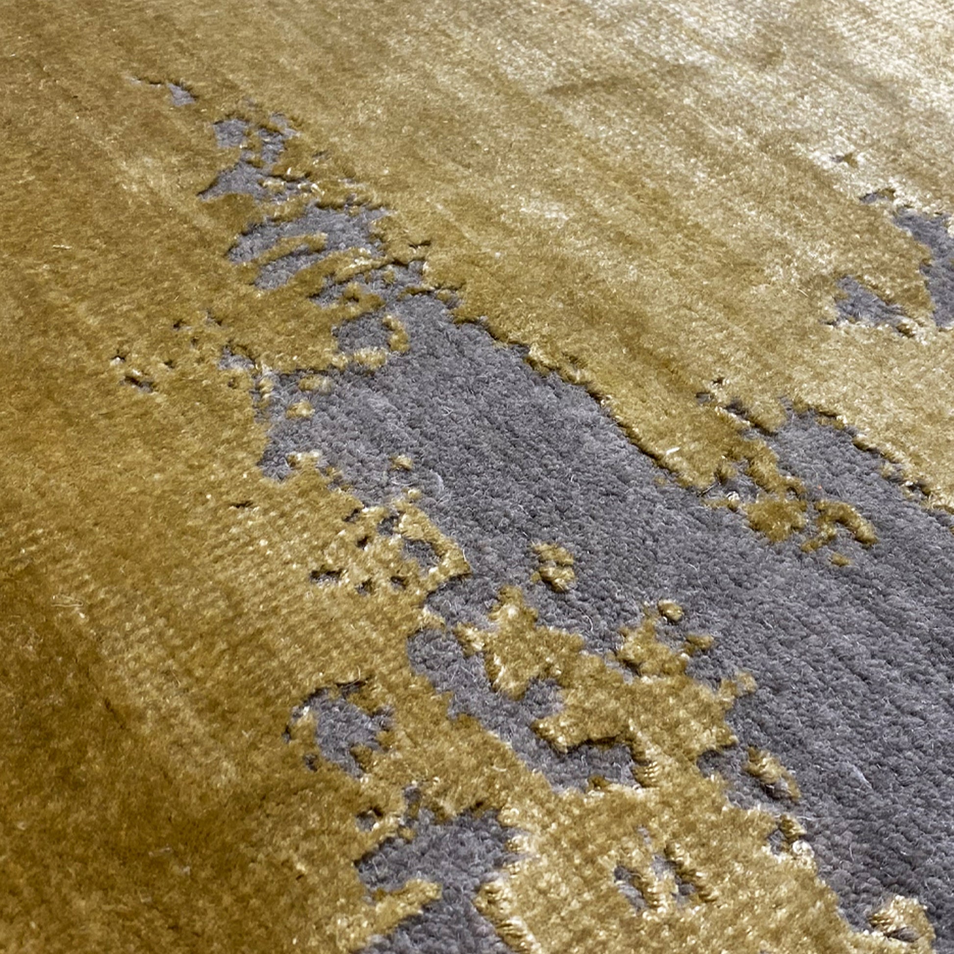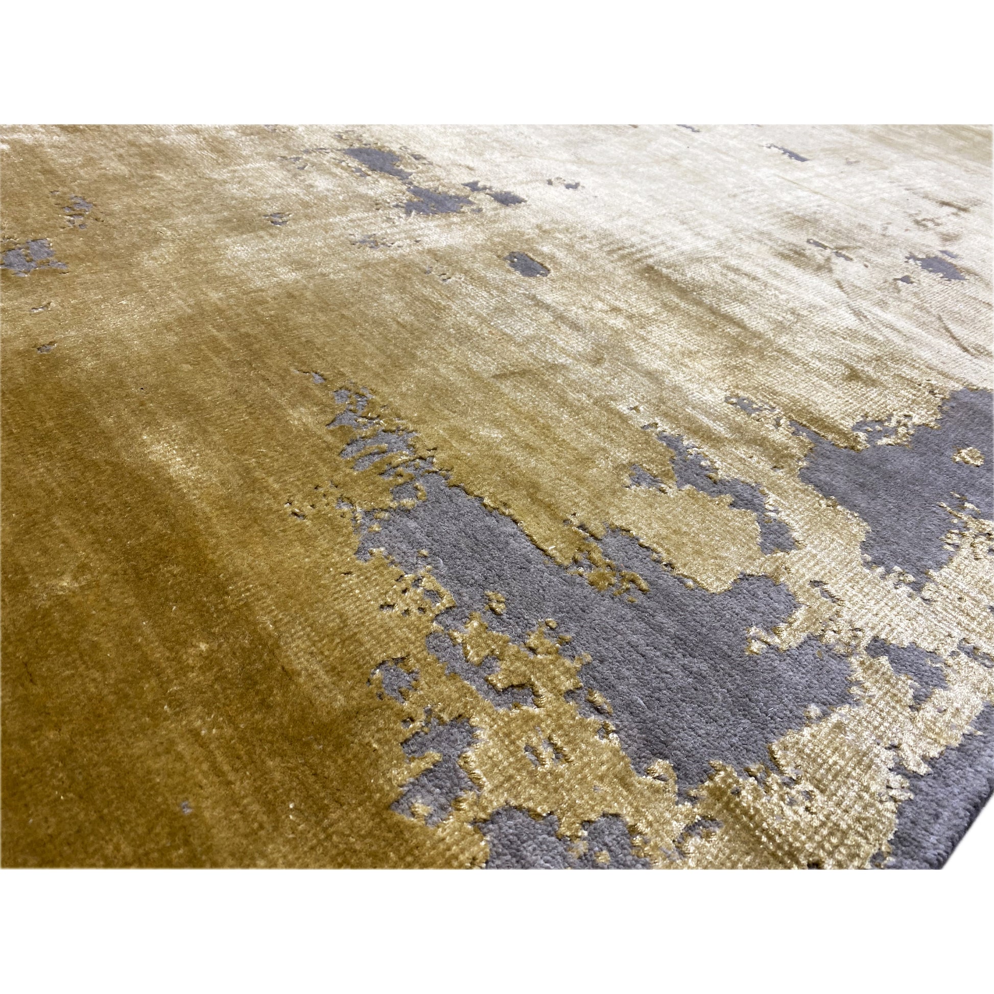 This hand-knotted, modern carpet made from a high-quality blend of hand-spun wool and viscose is a luxurious highlight for your home. The carpet impresses with its abstract pattern featuring a striking gradient from light to dark gold on a subtle gray border, giving it an elegant used look. With its generous size of 300x196 cm, it is perfect for adding a warm, stylish atmosphere to large living areas. The viscose also provides a noble sheen.