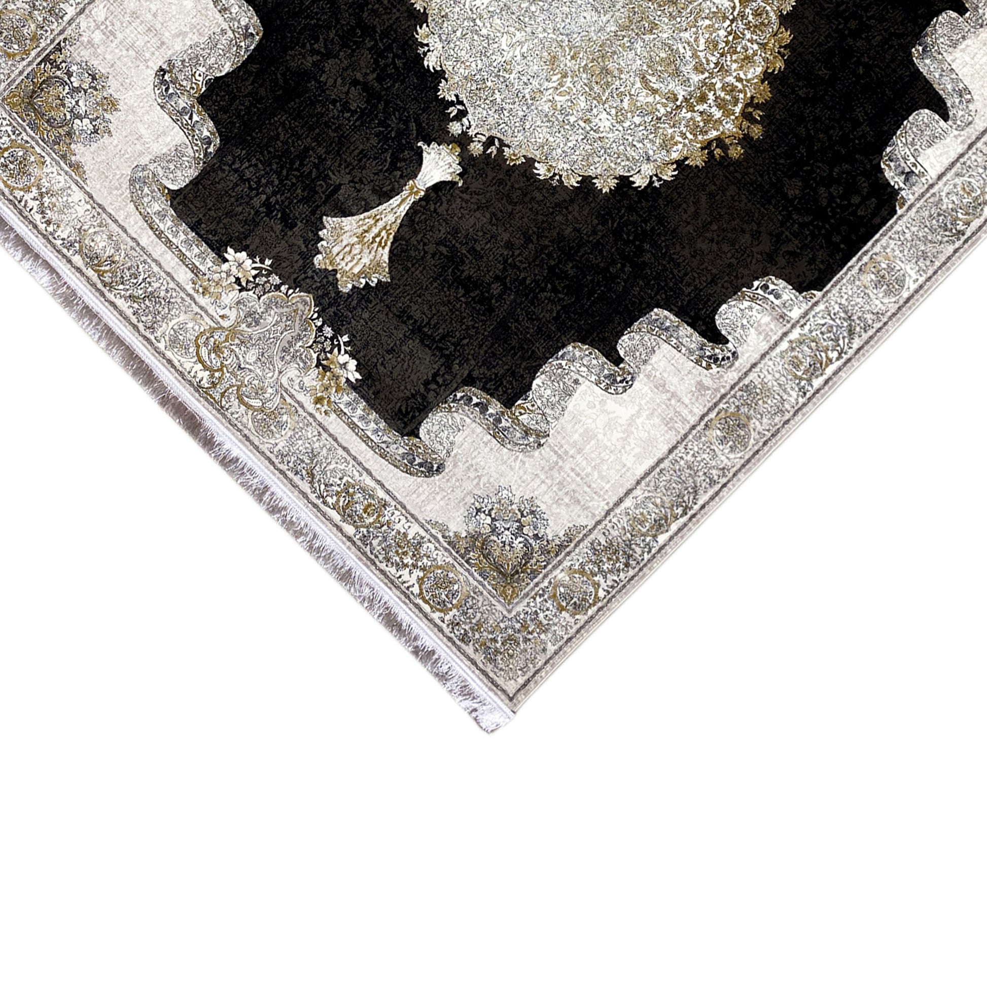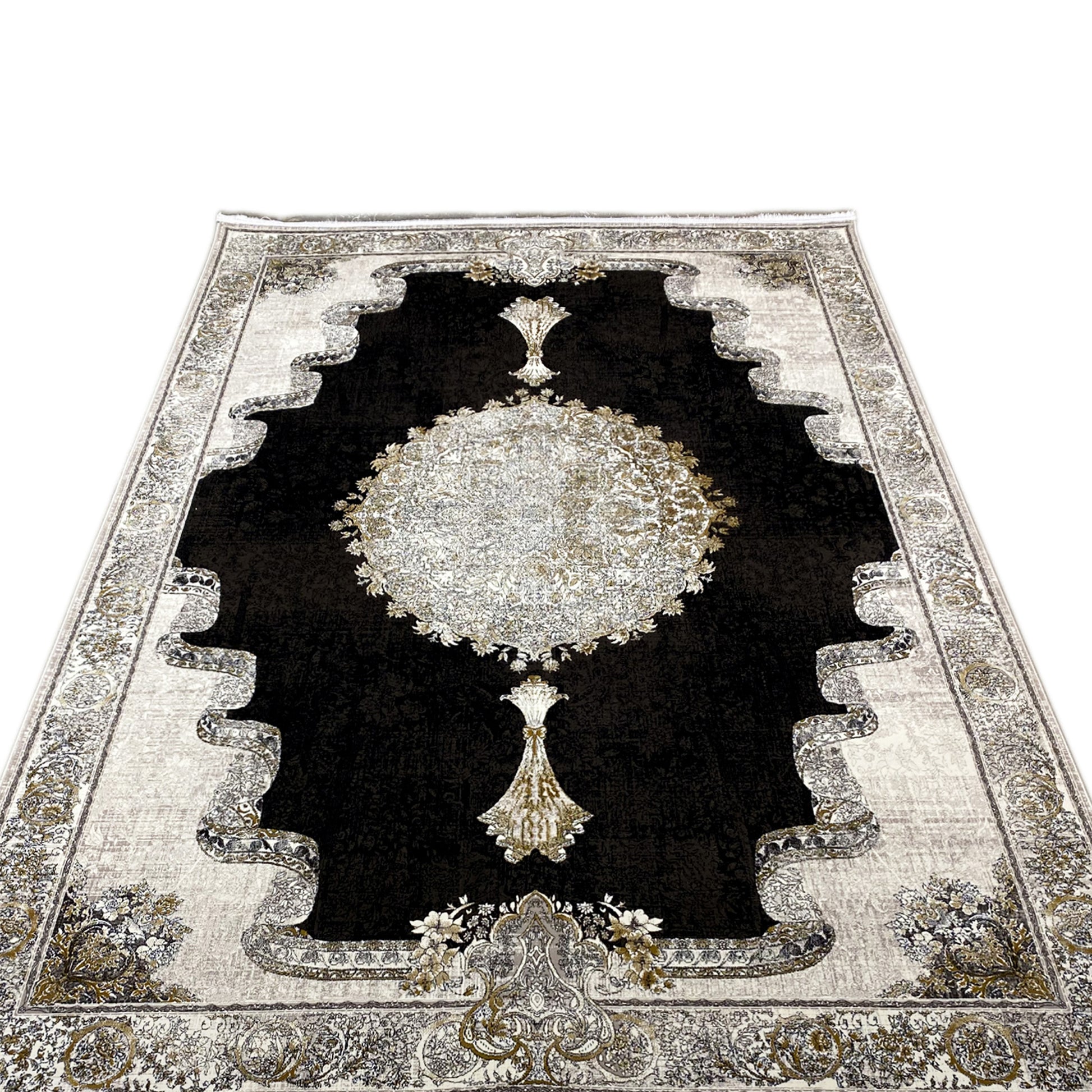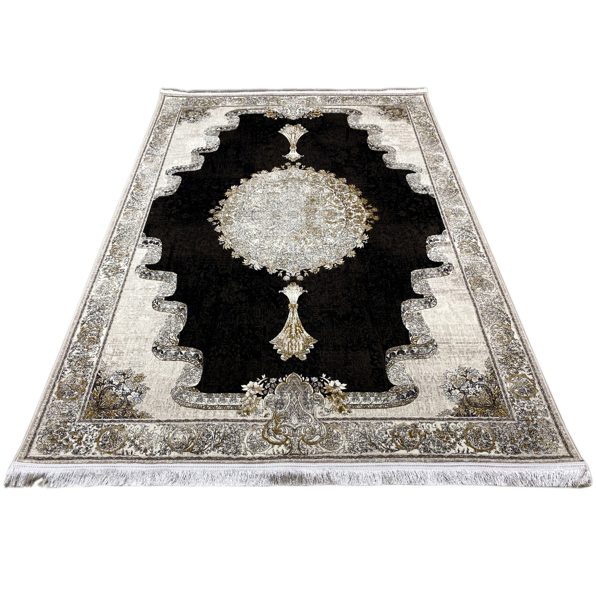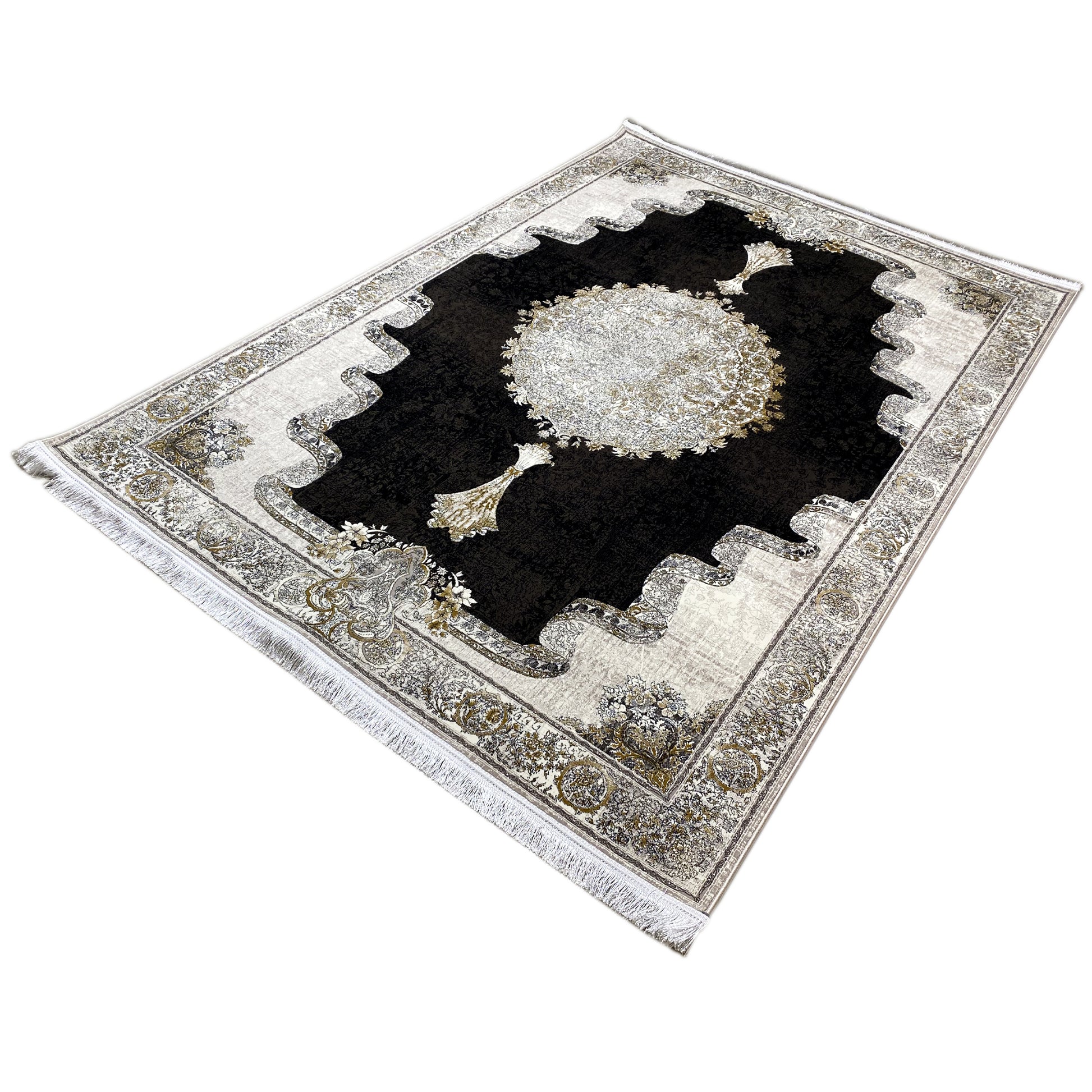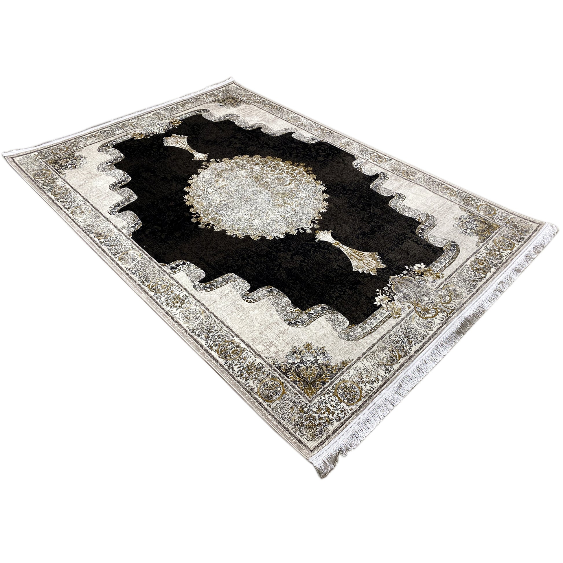 Add a touch of dramatic elegance to your home with this beautiful classic rug. Its striking dark inner field in smoke gray creates an impressive contrast to the light cream border and the intricately detailed medallion in the center. The unique border pattern adds an extra luxurious accent. Made from 100% heat-treated acrylic, this soft and durable rug is perfect for high-traffic areas, combining luxurious style with modern resilience. The generous size of 170x240cm is ideal for giving your living or bedroom an elegant focal point.