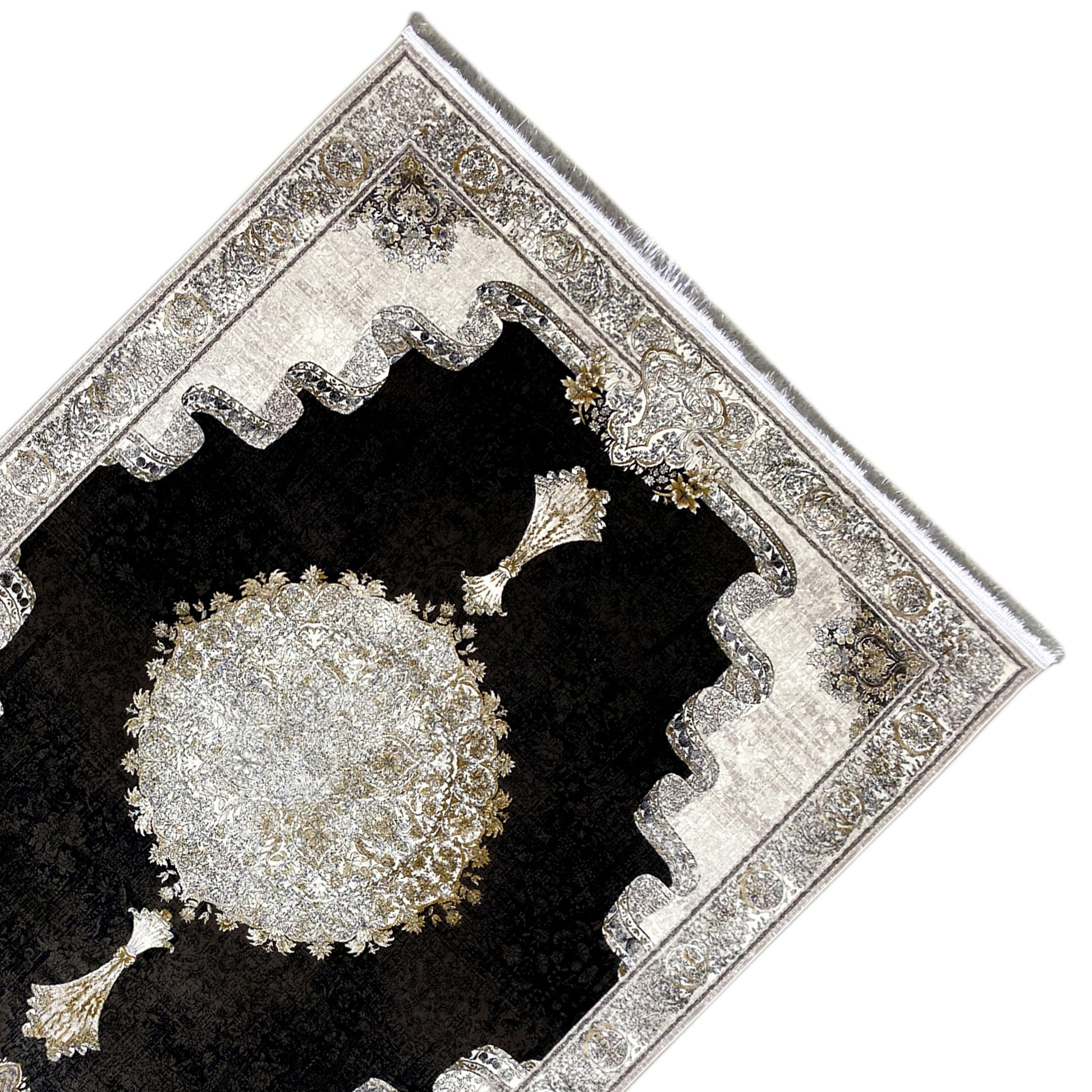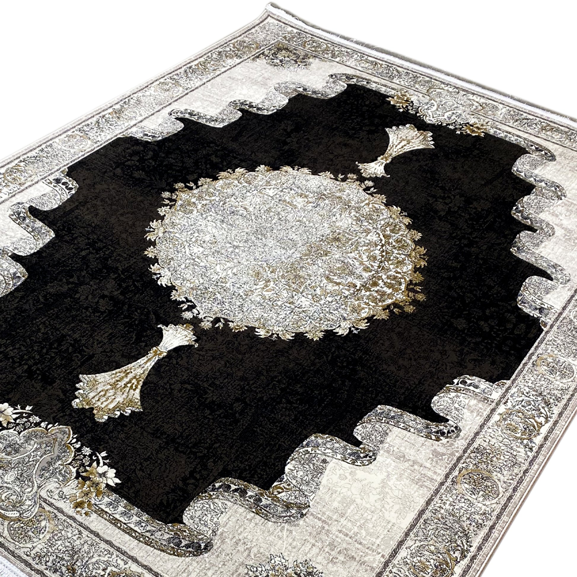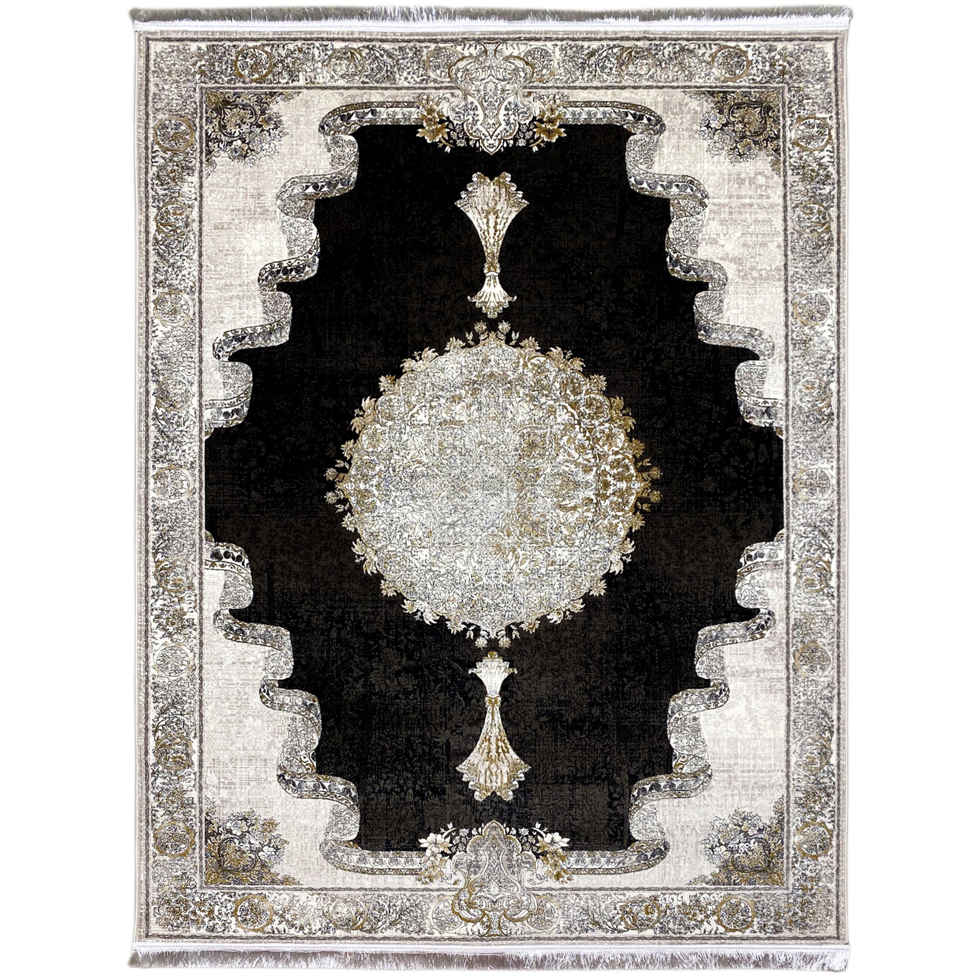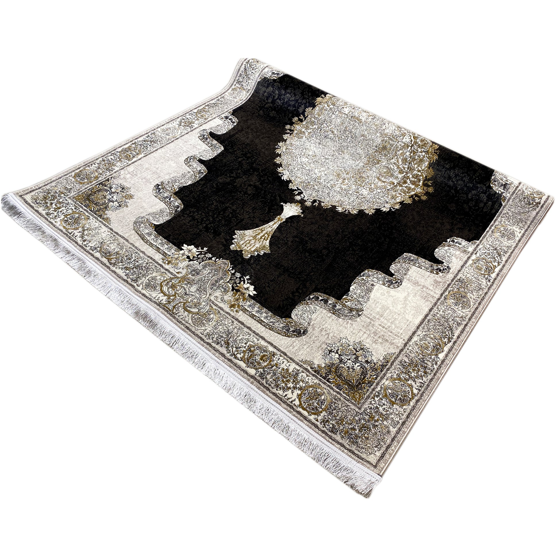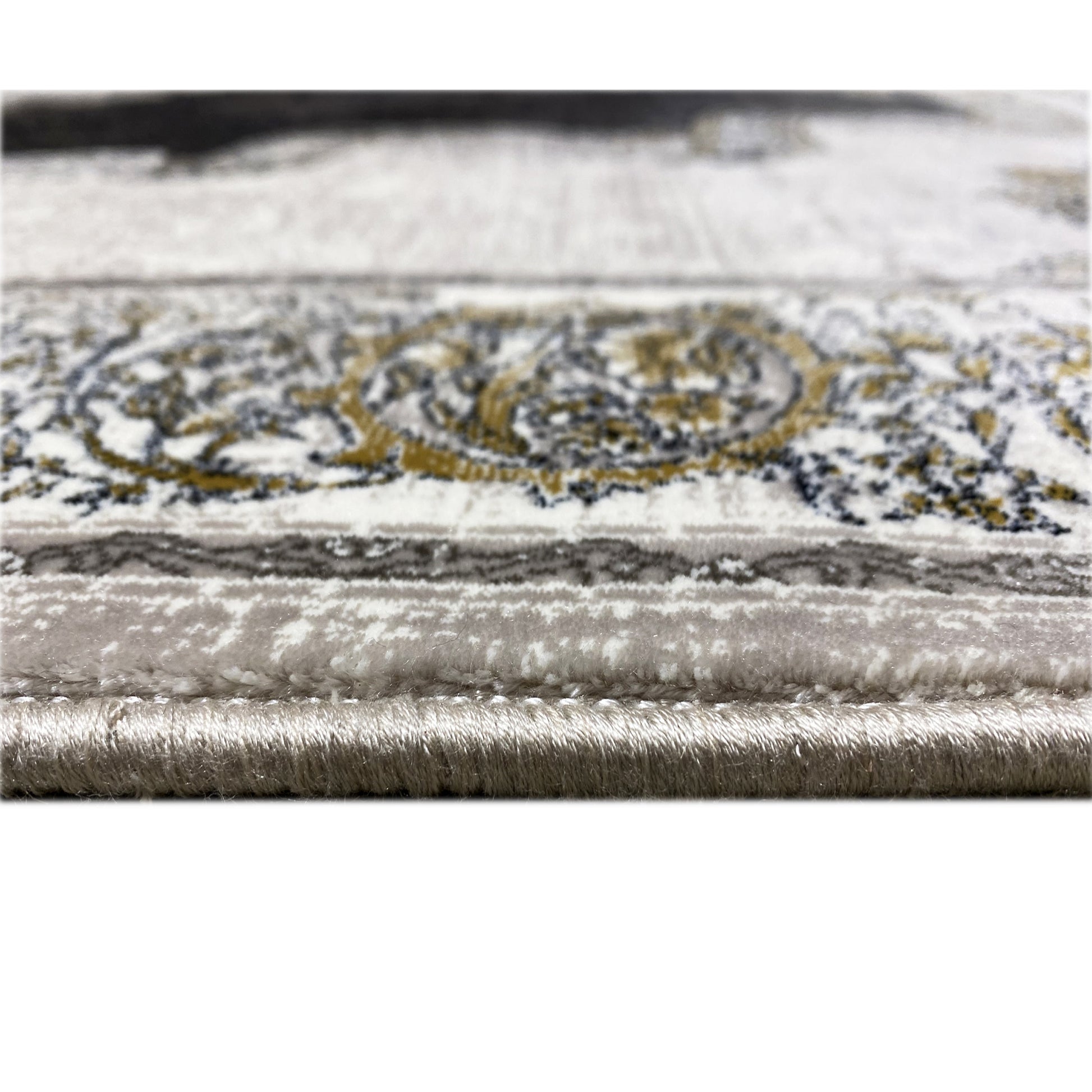Add a touch of dramatic elegance to your home with this beautiful classic rug. Its striking dark inner field in smoke gray creates an impressive contrast to the light cream border and the intricately detailed medallion in the center. The unique border pattern adds an extra luxurious accent. Made from 100% heat-treated acrylic, this soft and durable rug is perfect for high-traffic areas, combining luxurious style with modern resilience. The generous size of 170x240cm is ideal for giving your living or bedroom an elegant focal point.