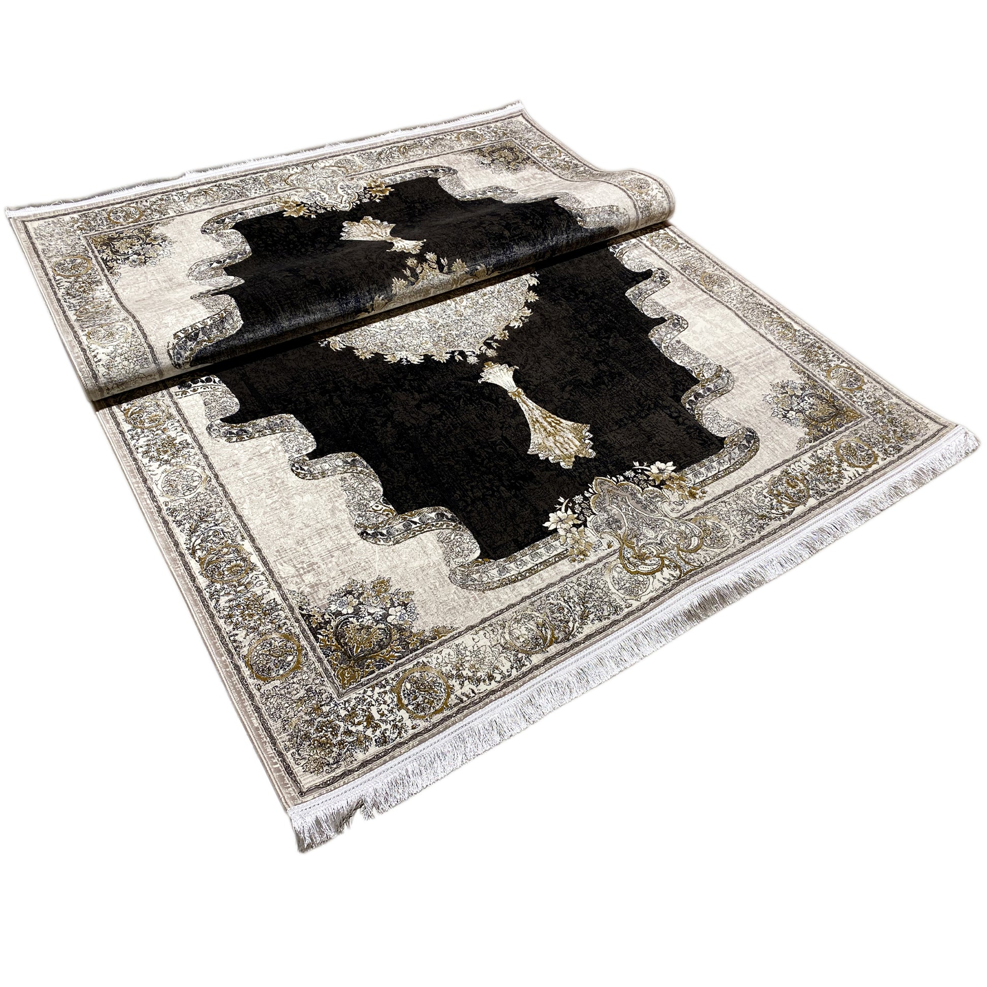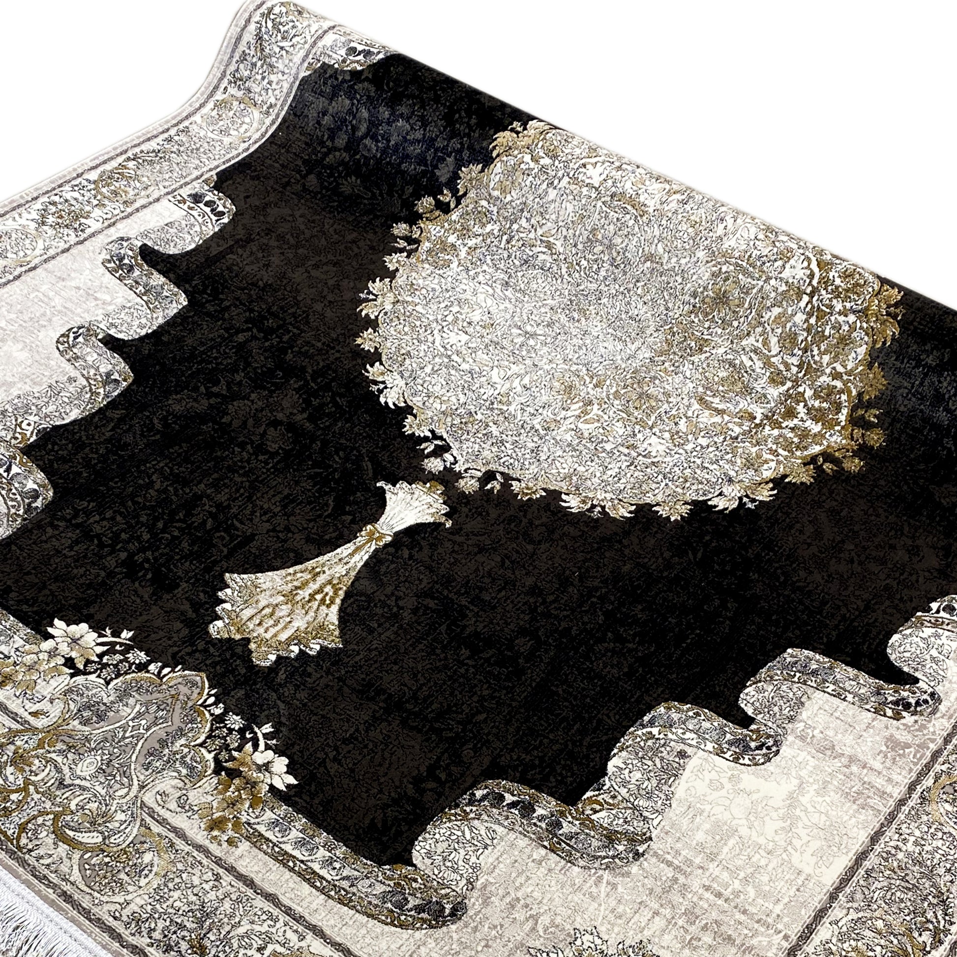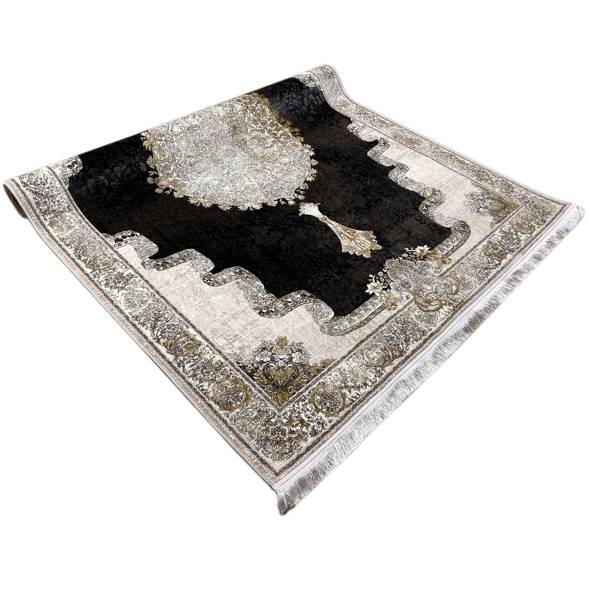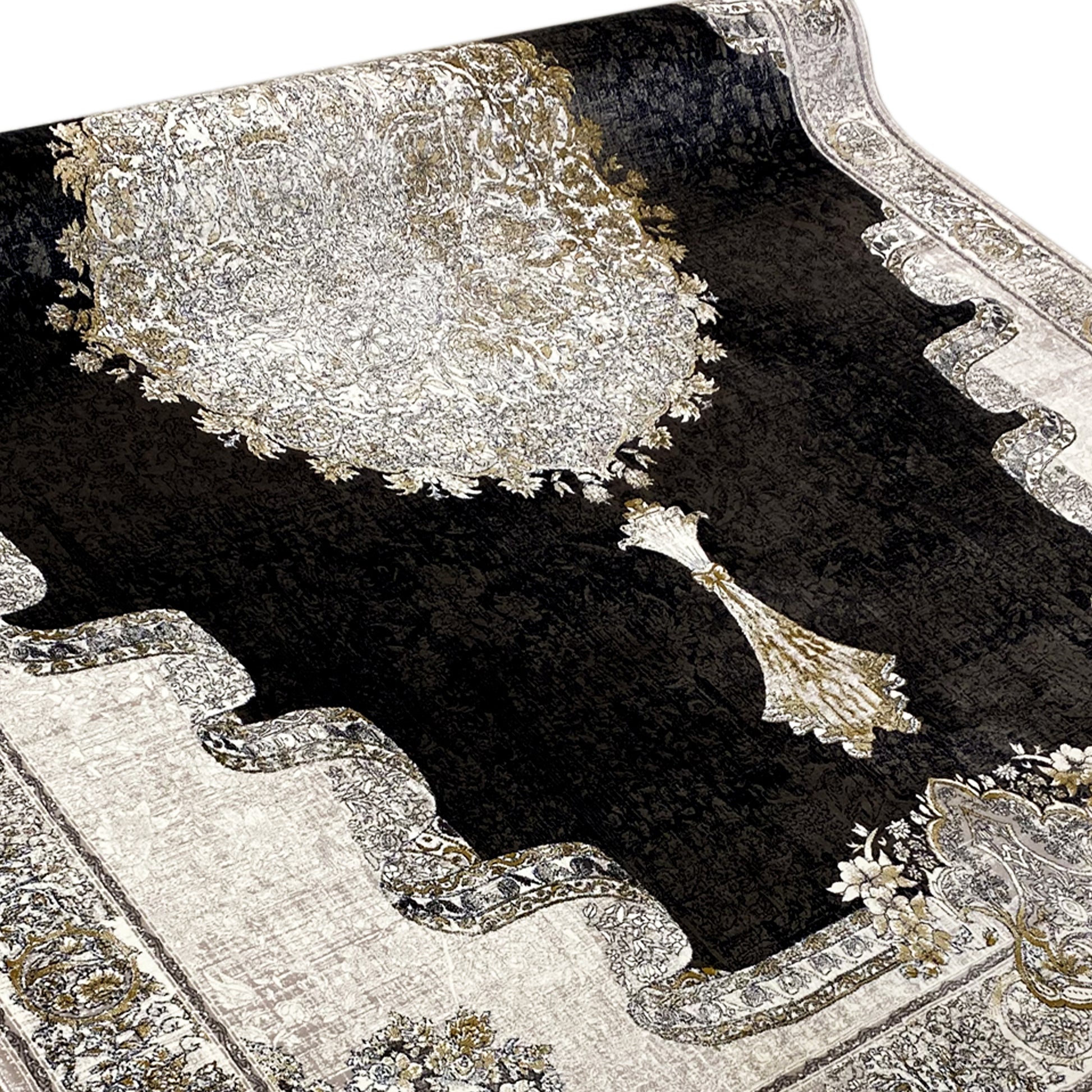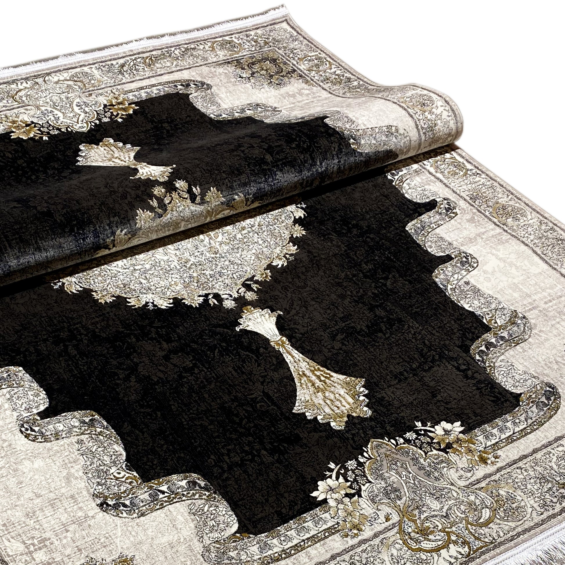 Add a touch of dramatic elegance to your home with this beautiful classic rug. Its striking dark inner field in smoke gray creates an impressive contrast to the light cream border and the intricately detailed medallion in the center. The unique border pattern adds an extra luxurious accent. Made from 100% heat-treated acrylic, this soft and durable rug is perfect for high-traffic areas, combining luxurious style with modern resilience. The generous size of 170x240cm is ideal for giving your living or bedroom an elegant focal point.
