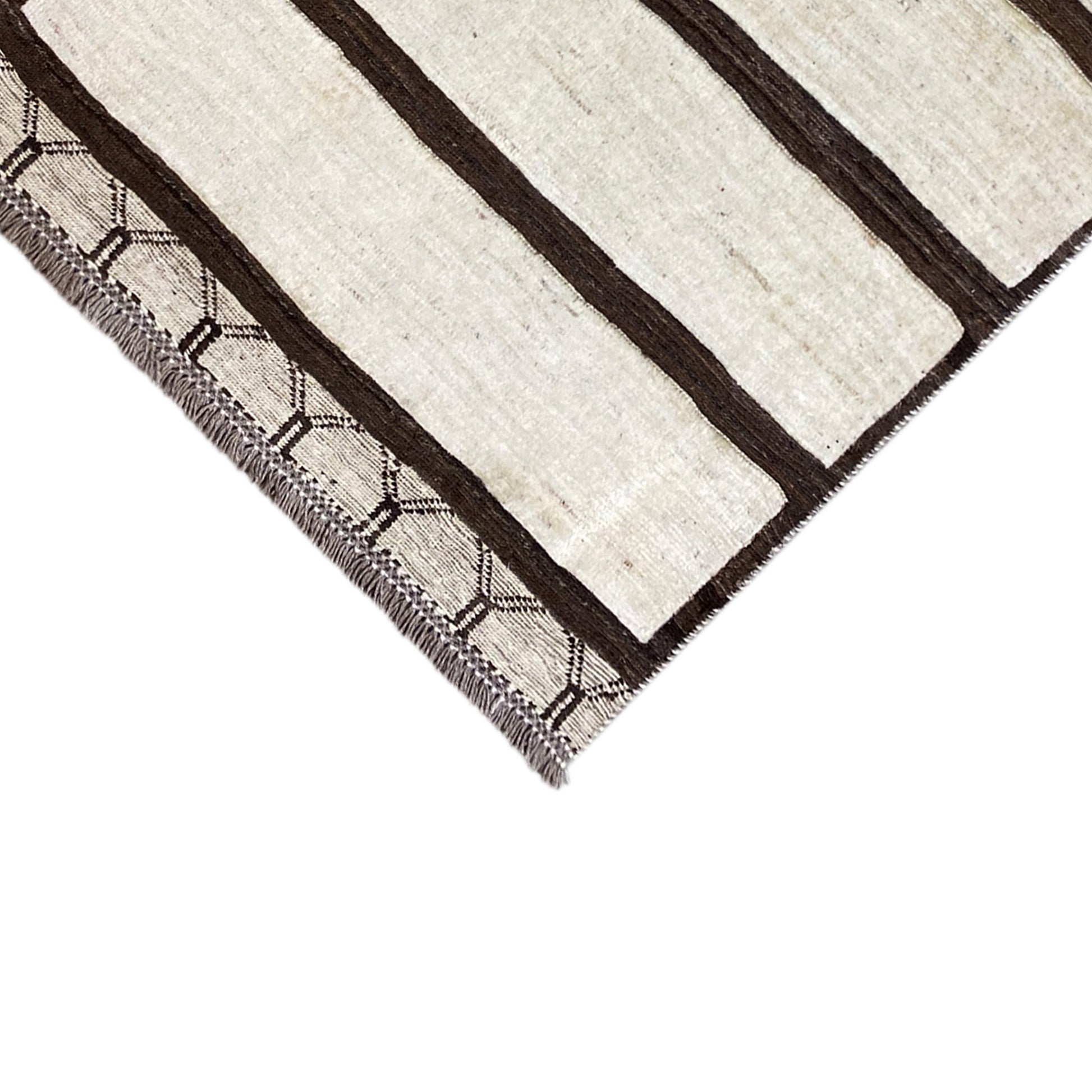 Made from hand-spun, plant-dyed wool, the rug features a calm block stripe pattern in natural beige and brown tones, accented by fine geometric details on the edges. With its compact dimensions of 161x92 cm, it is ideal for smaller rooms, hallways, or as a subtle design accent.