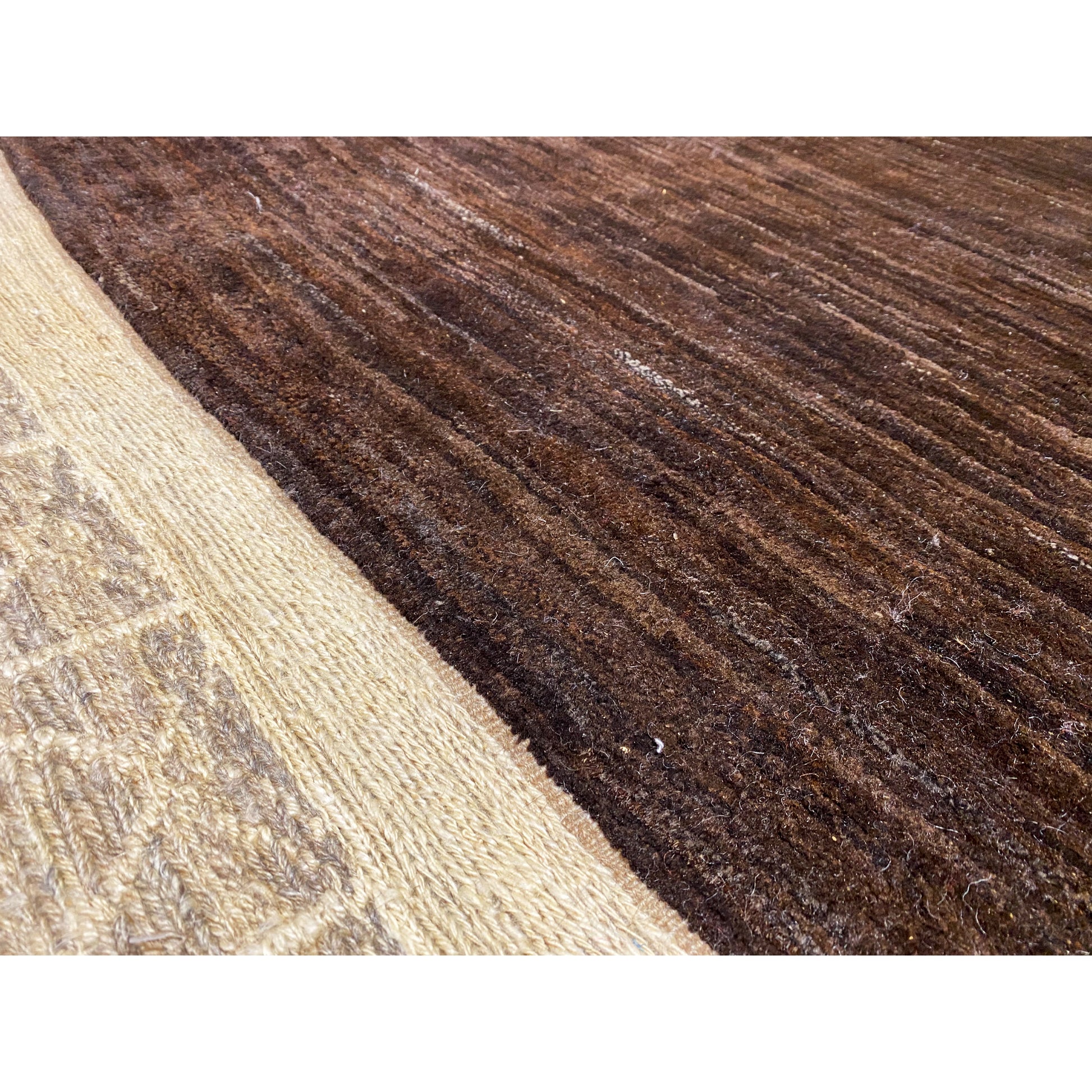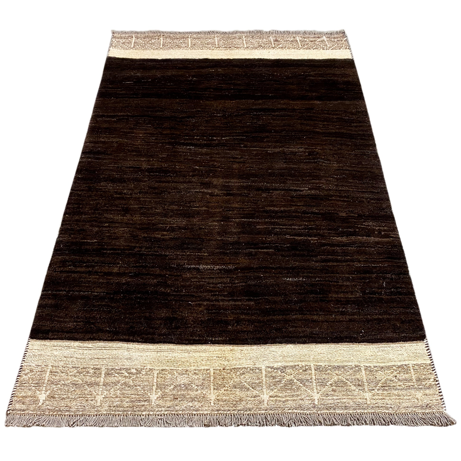 Made from hand-spun, plant-dyed wool, the rug impresses with its calm, block-like pattern in deep brown and subtle light accents. With its dimensions of 184x113 cm, it is ideal for smaller rooms, hallways, or as a stylish accent in modern living spaces.