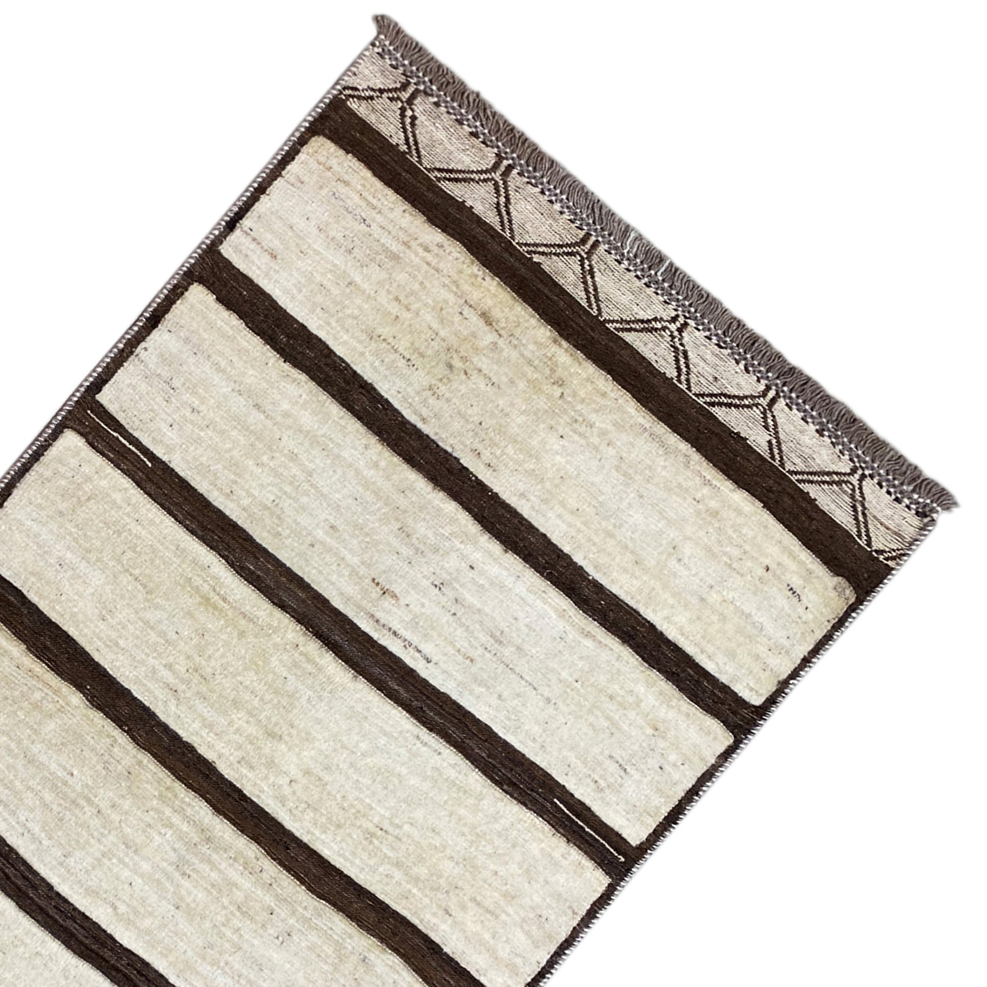 Made from hand-spun, plant-dyed wool, the rug features a calm block stripe pattern in natural beige and brown tones, accented by fine geometric details on the edges. With its compact dimensions of 161x92 cm, it is ideal for smaller rooms, hallways, or as a subtle design accent.