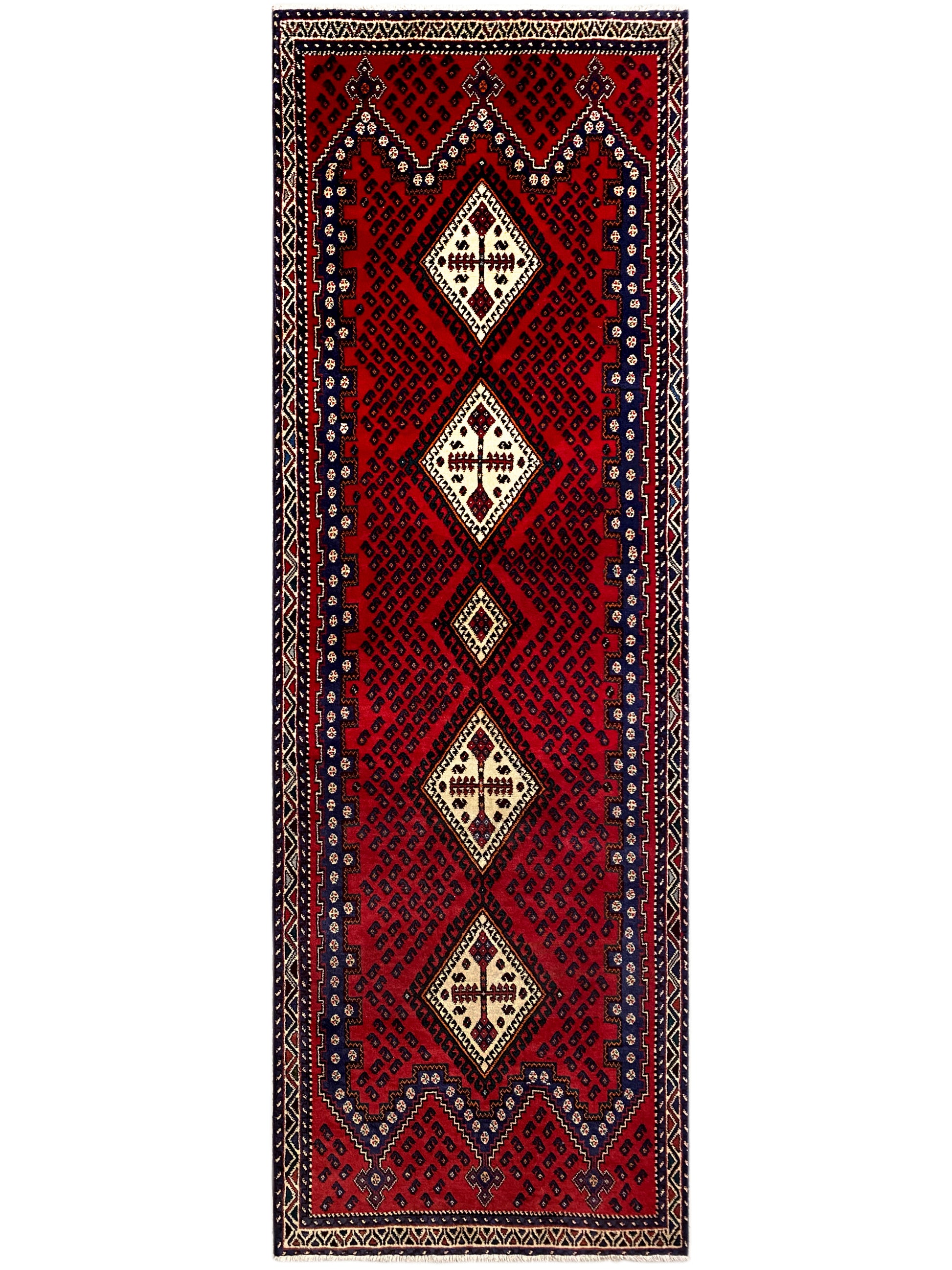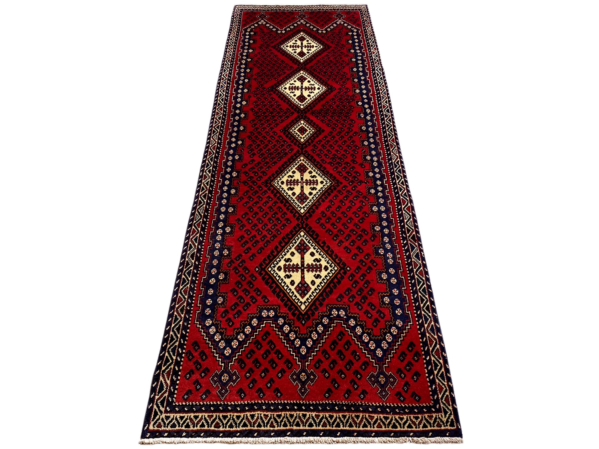 This hand-knotted Sirjan runner rug features a traditional geometric design in a deep red tone, accented by cream, blue, and black details. The pattern consists of a series of stylized diamonds arranged along the longitudinal axis and framed by a detailed border with floral and geometric elements. Made from high-quality, hand-spun wool and dyed with plant-based colors, this rug impresses not only with its vibrant colors and appealing design but also with its natural texture and durability. With its dimensions of 282x89 cm, it is ideal for stylishly enhancing hallways, entryways, or other narrow spaces and adding a touch of oriental elegance. The classic pattern integrates wonderfully into traditional, rustic, or eclectic decor styles, creating a warm and inviting atmosphere. This rug is not only a high-quality floor covering but also a testament to traditional Persian knotting craftsmanship and natural beauty.