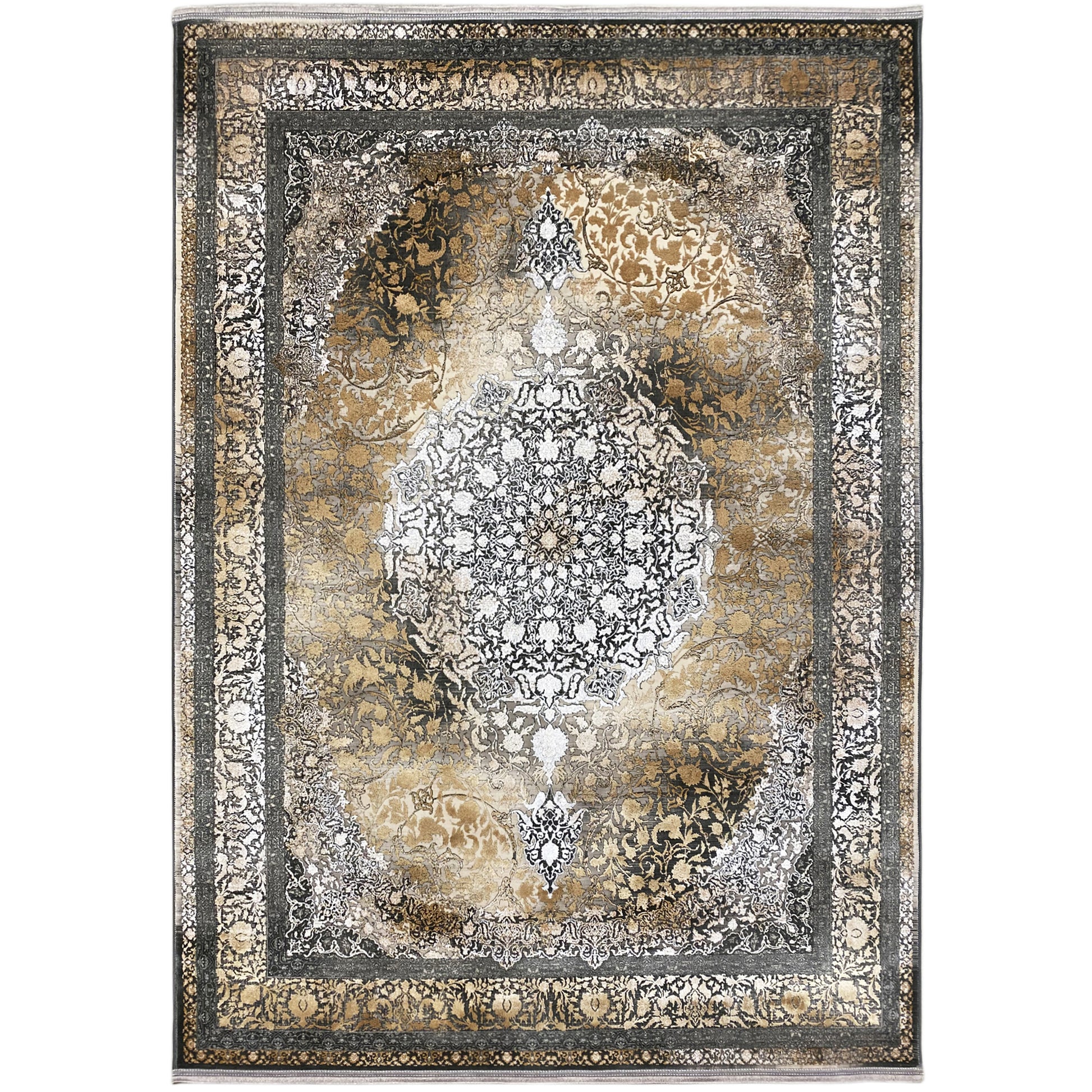 Give your home a touch of vintage elegance with this beautiful modern classic rug. Its artistic central medallion stands out against a stunning smoky golden-brown background with a subtle color gradient and a distressed look. Made from 100% heat-treated acrylic, this soft and durable rug is perfect for high-traffic areas, combining luxurious style with modern resilience. The generous size of 170x240cm is ideal for adding a sophisticated focal point to your living or bedroom.